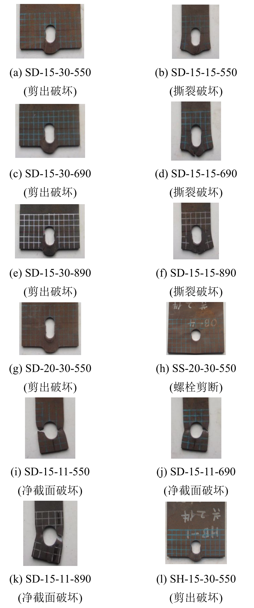 4)螺栓孔径对破坏模式的影响不明显,相似的螺栓孔变形和剪切断裂线特征出现在两种不同孔径的连接中,例如试件SD-15-30-550(图6(a))和SH-15-30-550(图6(l))。