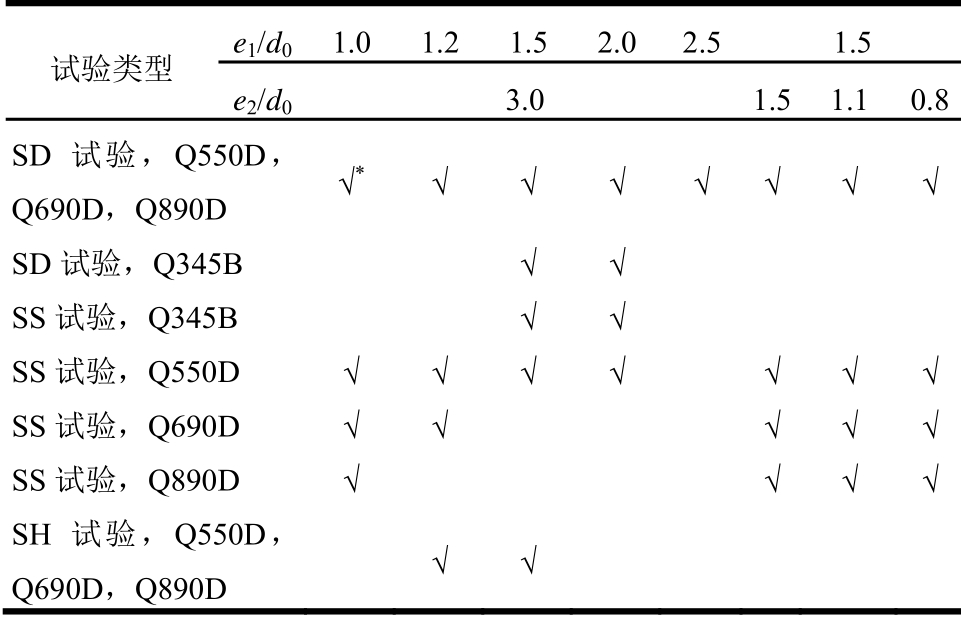 试验类型 e1/d0 1.0 1.2 1.5 2.0 2.5 1.5 e2/d03.0 1.5 1.1 0.8 SD试验,Q550D,Q690D,Q890D √* √ √ √ √ √ √ √SD试验,Q345B √ √ SS试验,Q345B √ √ SS试验,Q550D √ √ √ √ √ √ √SS试验,Q690D √ √ √ √ √SS试验,Q890D √ √ √ √SH试验,Q550D,Q690D,Q890D √ √