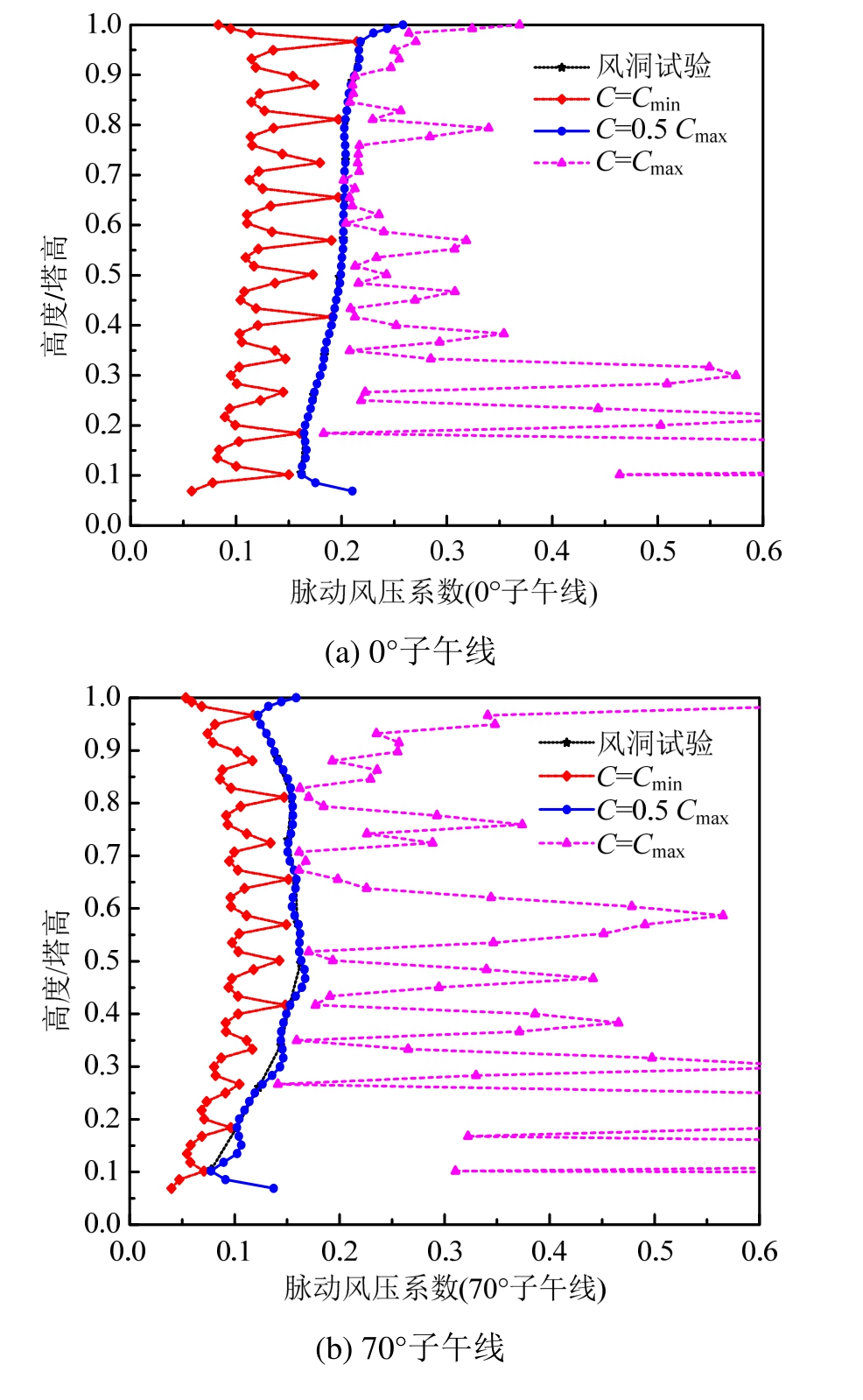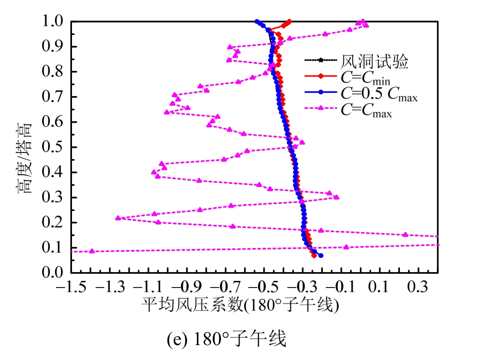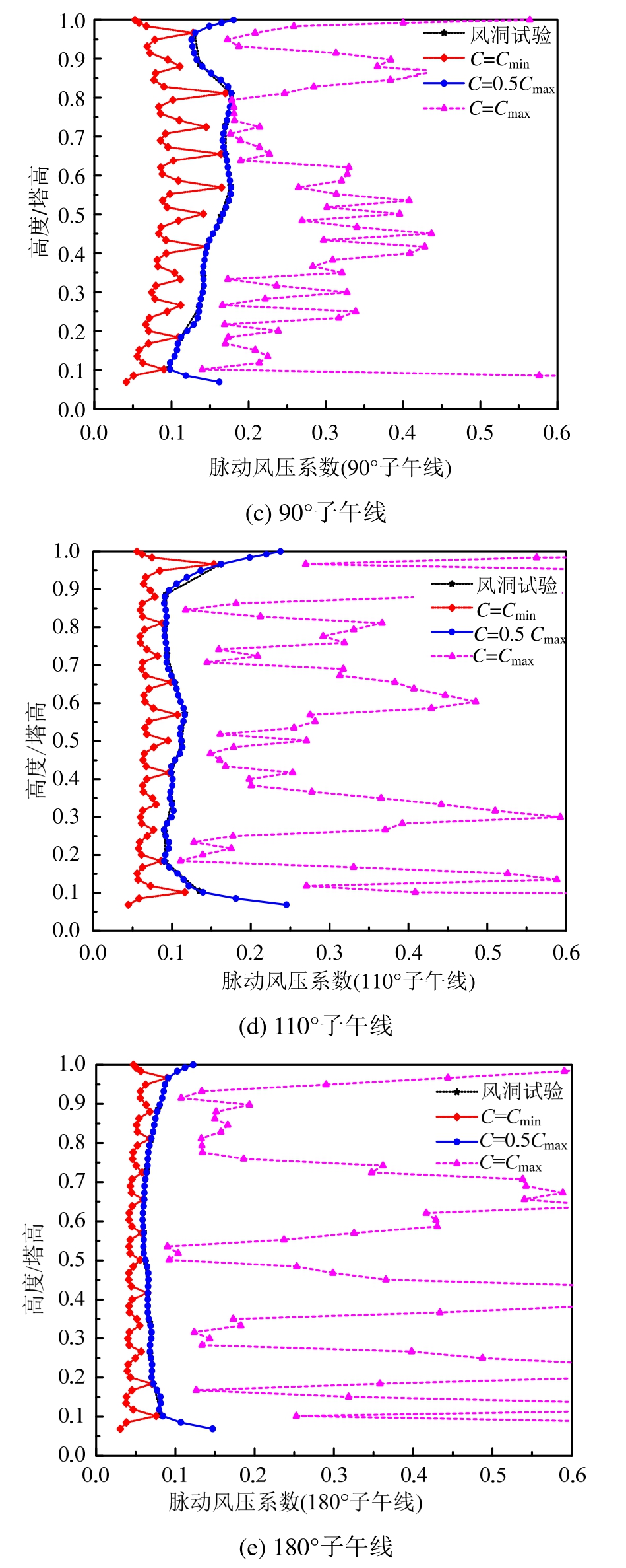 从图3和图4可以看出,当C=0.5 Cmax时,重构风场的风压系数基本与风洞试验结果完全一致。而当C=Cmin时,重构风场只有在110°和180°子午线上的平均风压系数比较接近风洞试验结果, 而其它子午线上的风压系数都与风洞试验结果有一定的差异。当C=Cmax时,重构风场各子午线上的风压系数与风洞试验结果差异的分布都较为离散。这表明随着C值的增大,重构风场风压系数的随高度的变化变的更加趋于非线性。综合可知,当C=0.5 Cmax时,重构风场各子午线上的风压系数与风洞试验结果一致性最好;而C值取最大值时,并不能再进一步提高与风洞试验结果一致的精度,反而会导致风场的分布更加复杂。