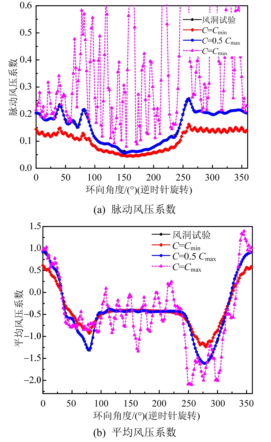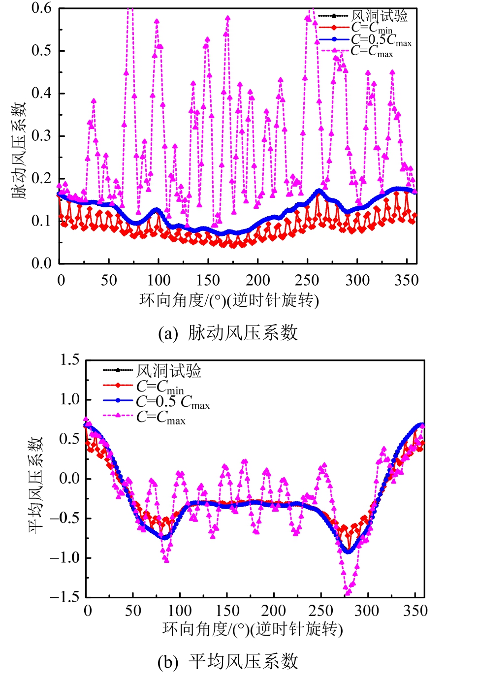 图5和图6为重构风场前后两个不同高度处环向上风压系数的对比结果。从这两个图中可以看出,当C=0.5 Cmax时,冷却塔底部(0.18倍塔高处)环向上和喉部高度环向上的风压系数基本与风洞试验结果完全一致。而C=Cmin或C=Cmax时,重构的风场与风洞试验结果都有一定的差异。且C=Cmax时,重构的风场的分布最为复杂。因此,C值不宜取得过大。