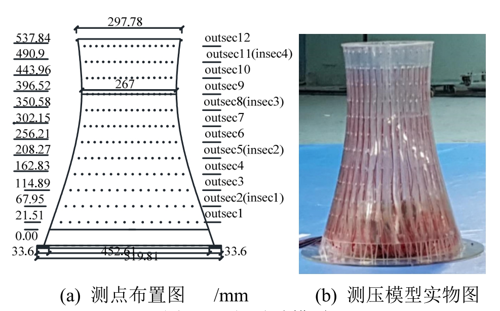 选用某地区150 m高的自然通风冷却塔进行风洞试验,该冷却塔几何尺寸为:塔高H=150 m,零米直径112.2 m,出口直径72.0 m,喉部直径66.7 m,支柱采用46对V字型支柱,环板基础。本次试验是在同济大学TJ-3号风洞中完成的,试验对象为1∶250测压模型,在待测模型沿通风筒环向与子午向布置36×12个外表面压力测点、36×4个内表面压力测点,其表面测点分布如图1(a)所示。模拟出的风场为B类紊流场,试验参考点选在模型塔顶处。试验风速为10 m/s,模型通风筒表面粘贴均匀分布的36条3层粗糙纸带(此条件下雷诺数效应模拟为最好)。采用同步扫描测压技术,测压信号采样频率为300 Hz,每个测点采样时长为60 s,即采样样本总长度为18000个数据。