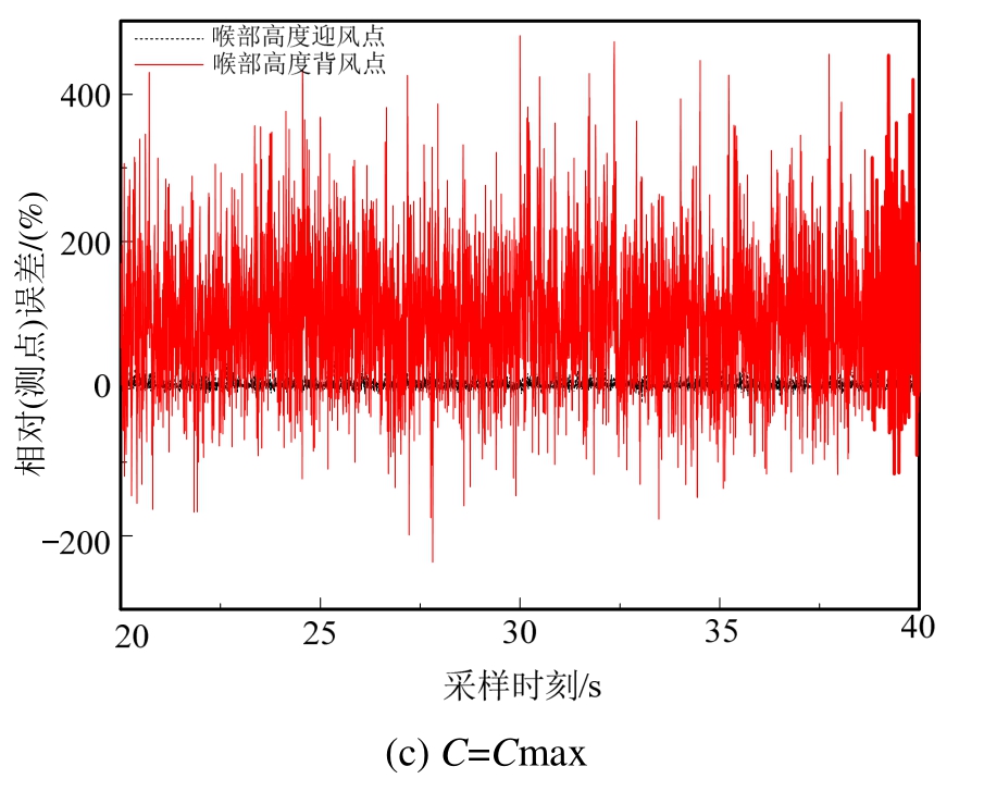 图2为各时刻下重构前后喉部高度迎风点和背风点的风压系数相对误差图。从图2可以看出,当C=0.5Cmax时,在整个采样时间内,时程风压系数相对误差基本上都在5%以内,这说明此时重构的风场在每个时刻下的值都是合理的。而当C=Cmin和C=Cmax时,时程风压系数的相对误差均反映出与风洞试验结果有一定的差距。