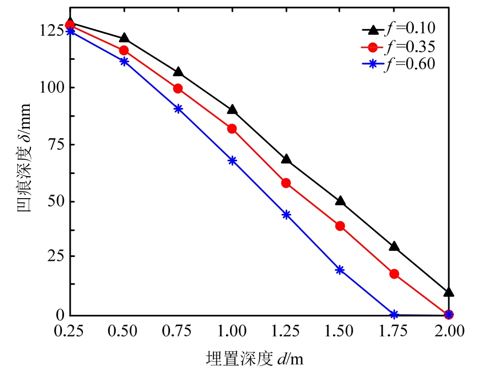 为研究摩擦对埋置管道损伤的影响,计算不同摩擦系数下管道与质量为3000 kg的球状坠物(v=vt=8.832 m/s)撞击时的凹痕深度。为简化计算,海床土体考虑为均质粘土(Su=18 kPa),结果如图16所示。对于埋置管道,坠物与土体间的摩擦系数对于管道的损伤存在一定影响:1)摩擦系数越大,管道损伤越小。 f=0.6时,其安全埋深为1.75 m,而f=0.1时,即使埋深d=2 m,仍存在10mm的凹痕;2)埋深较小时,摩擦对于损伤的影响不大。埋深d=0.25时,摩擦系数分别为f=0.60及f=0.10时,管道的凹痕深度差值仅4 mm;但随着埋深的增加,摩擦作用逐渐明显,埋深d=1 m时,二者的差值达到22 mm。这是由于埋深较大时,坠物与管道接触前,需克服更多的土体阻力。