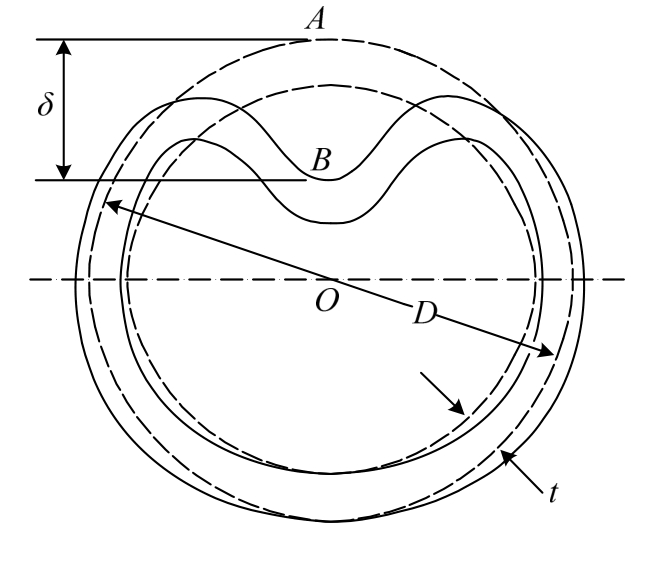 管道经撞击后,表面会产生凹陷。最大凹陷处的横截面如图3所示,圆心到A、B两点距离的差值即为凹痕深度δ[21]。