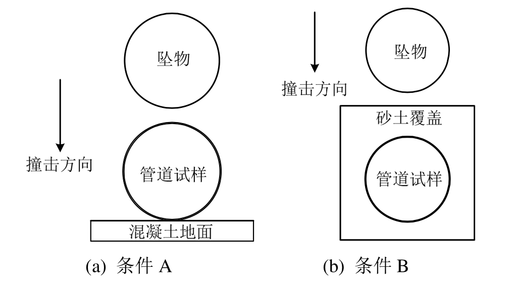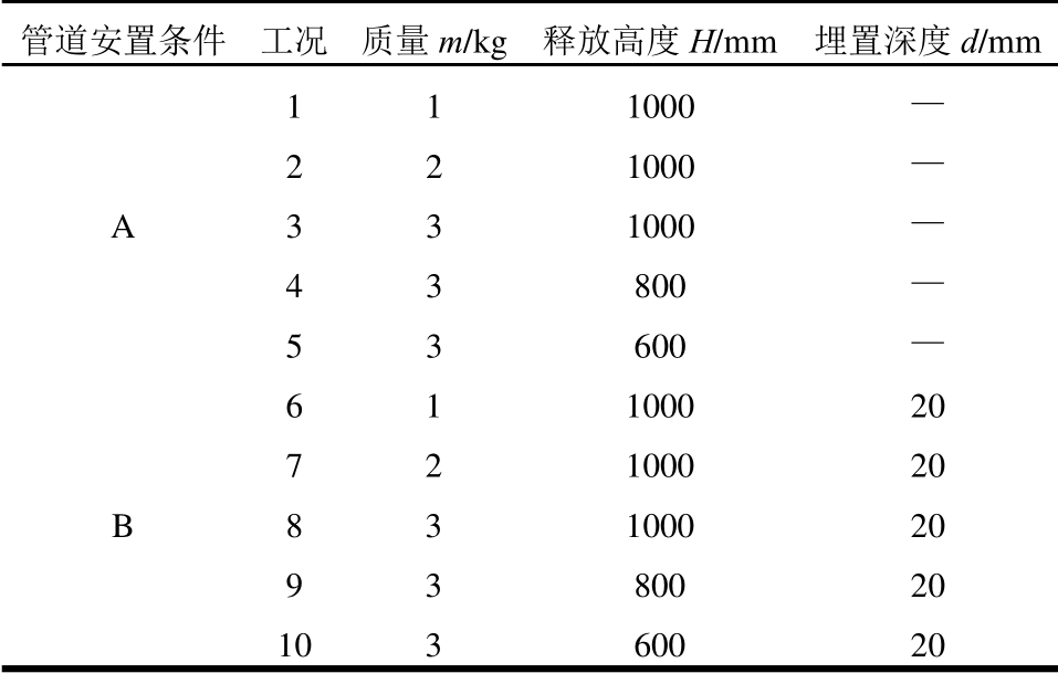 管道安置条件 工况 质量m/kg 释放高度H/mm 埋置深度d/mm A 1 1 1000 — 2 2 1000 — 3 3 1000 — 4 3 800 — 5 3 600 — B 6 1 1000 20 7 2 1000 20 8 3 1000 20 9 3 800 20 10 3 600 20