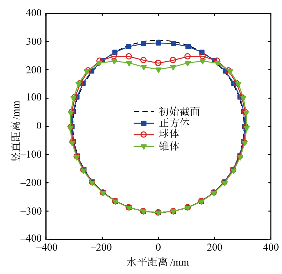 图18为埋深d=1.0 m时,不同坠物撞击管道的横截面变形。可见:正方体坠物对管道造成的损伤程度较小,截面呈近似椭圆形。球体及锥体坠物对管道造成的损伤程度较大,凹痕深度从两侧至中心逐渐增大,截面近似呈“桃形”。