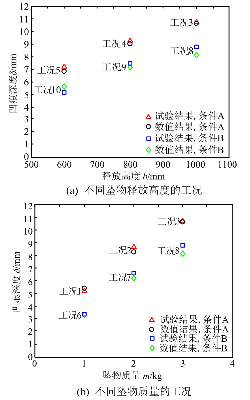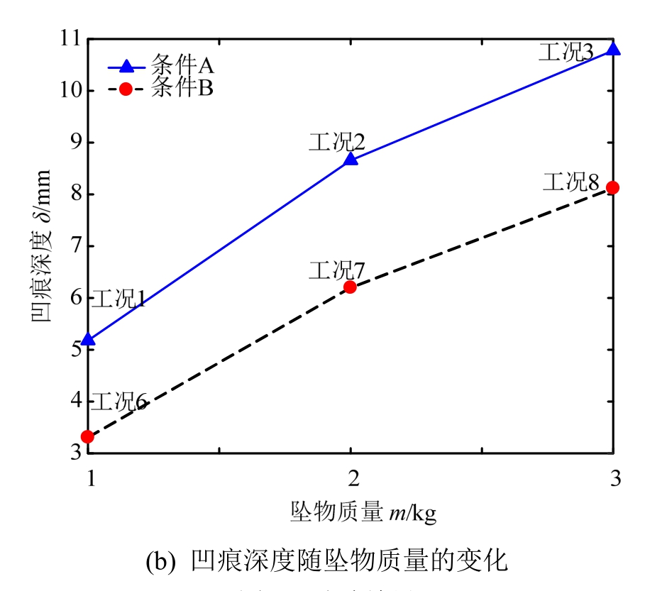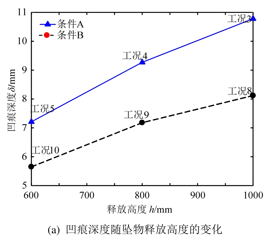 图4(a)、图4(b)给出了管道凹痕深度随坠物释放高度、质量的变化。由结果可知,管道的凹痕深度取决于撞击能量的大小以及管道的安置条件。安置条件相同时,管道凹痕深度随着坠物质量、释放高度的增加而明显增大;撞击能量相同时,由条件A及条件B的凹痕深度对比可知,管道的埋深能抵御一部分坠物的冲击能量,对管道起到保护作用。