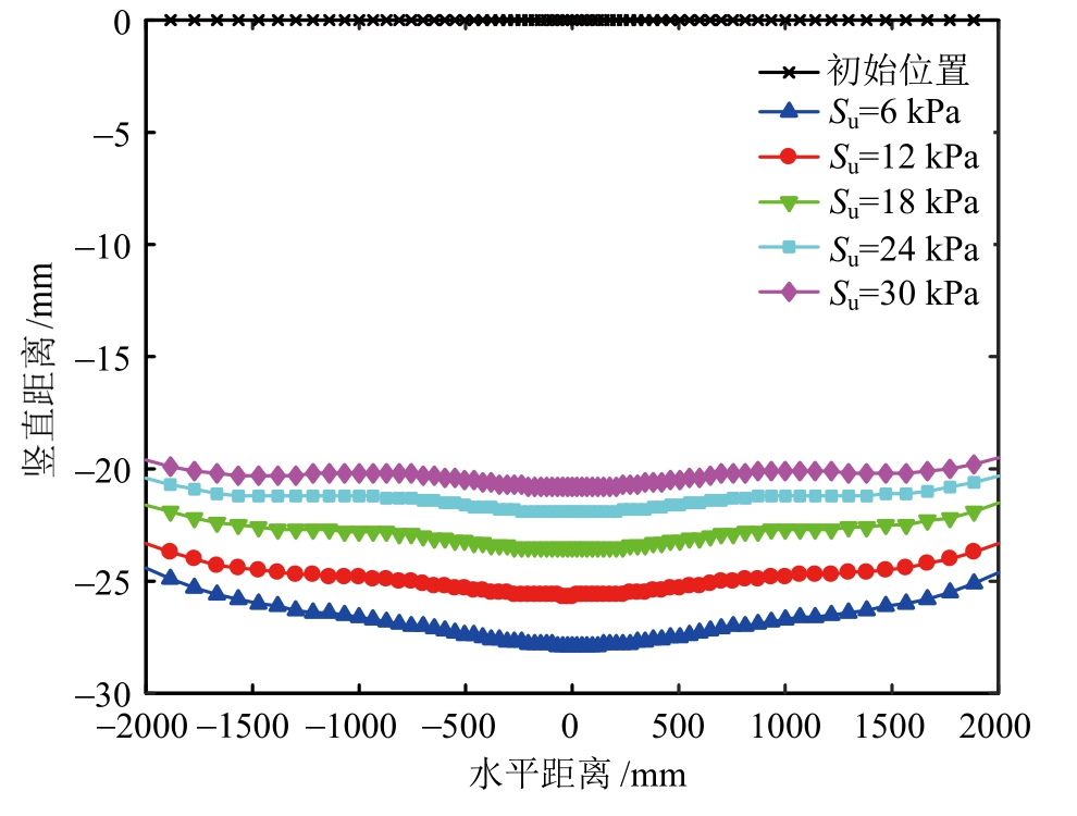 图10 不同土体强度下管道底部节点垂向位移的纵向分布