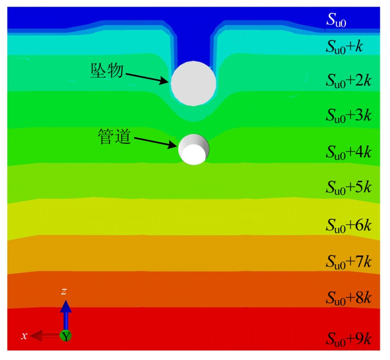 工程实践表明,深海海底的粘土多为正常固结粘土,其不排水抗剪强度Su随深度近似线性增加,如图11所示,Su(·)为嵌入深度z的函数,表示嵌入深度为z时粘土的不排水抗剪强度;Su0为海床表面处土体的不排水抗剪强度;k为强度增加梯度。已有的研究均将粘土海床简化成强度均匀的土体,忽略了其强度随深度增加的特性,这对管道的安全埋深设计影响较大,应予以考虑。