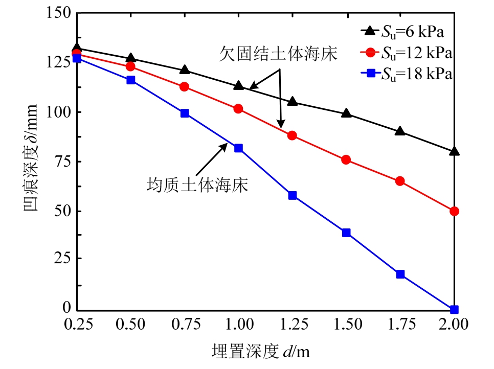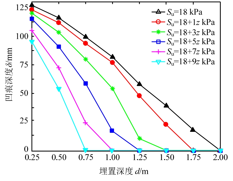 (3)对于埋置管道,正常固结粘土海床对管道的保护效果更好,与均质粘土海床相比,前者的安全埋深最多可减少1.25 m。管道凹痕深度随土体强度及埋深的增加而明显减小。综合考虑上述土质的影响,2 m左右的埋深可提供有效的保护。