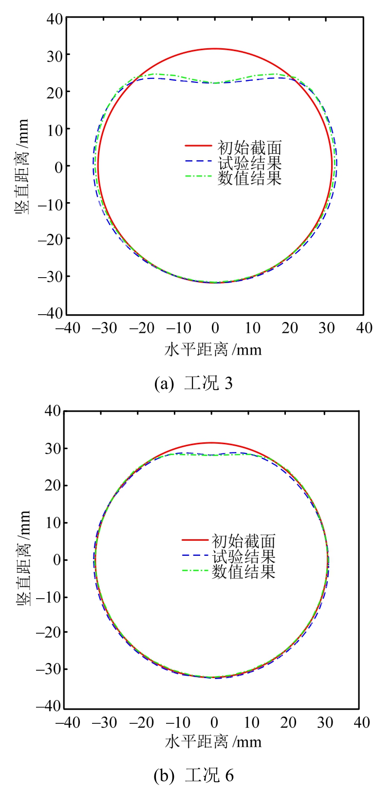 选取有代表性的工况3和工况6的管道横截面做对比,检验管道变形的模拟效果。如图7(a)~图7(b)所示,二者变形规律较为一致:对于撞击能量较小,有土层保护的工况6,截面变形十分吻合,表面出现微小的凹痕;对于撞击能量较大,且无土层保护的工况3,二者的截面均表现为椭圆形特征,并有向“桃形”发展的趋势。但二者管道顶部区域的形状存在微小偏差,可能是由于物理模型中管道试样的初始几何误差所造成的。对比结果证实了数值模型的有效性。