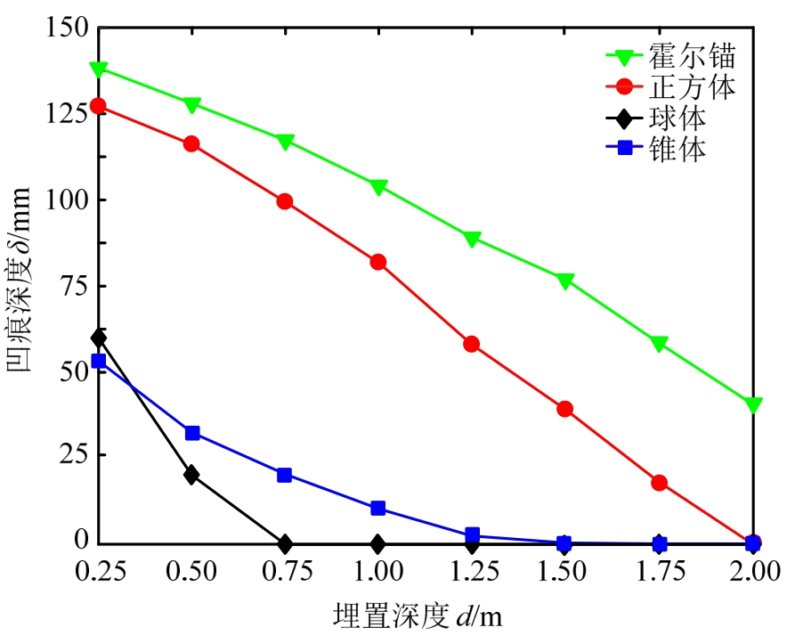 可以看出,管道凹痕深度的大小取决于坠物同土体、管道间的接触面积:1)随着接触面积的增大,管道的局部凹痕深度明显减小。在平台作业区条件下,对于接触面积较大的立方体坠物,管道的埋深在超过1.25 m后几乎没有损伤,而对于接触面积较小的球体及锥体坠物,仍然有较大的凹痕深度。与此相比,在锚泊作业区条件下,埋深d=0.25 m时,霍尔锚所造成的损伤略大于立方体坠物,而随着埋深的增加,其造成的损伤开始低于立方体坠物且不断降低。这是由于随着埋深的增加,其锚冠端部的凸缘部分与土体开始接触,增加了接触面积,其侵入土体时受到的阻力骤增,损耗了大部分能量;2)随着埋深的增加,坠物形状造成的管道损伤越发明显。在埋深d=0.25 m时,锥体、球体坠物对管道造成的凹痕深度的差值为12 mm。当埋深d=2 m时,球体坠物已不再对管道造成损伤,而锥体坠物仍对管道造成了37 mm的凹痕深度。可见,设计安全埋深时,应以尖锐的坠物为目标,进行极限工况设计。