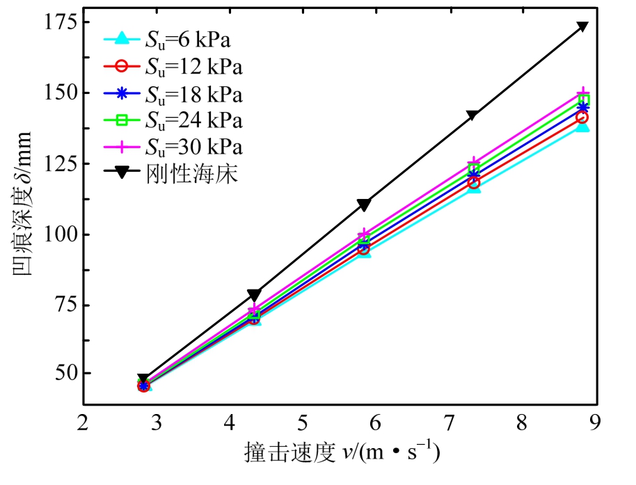 对于裸置在海床上的管道,为研究海床柔性及 土体性质对其动态响应及损伤的影响,以均质粘土海床为研究对象,计算管道在不同土壤条件下与质量为3000 kg的球状坠物(v=vt=8.832 m/s)时撞击时的损伤情况。管道凹痕深度的计算结果如图8所示。可以看出:1)凹痕深度随着速度的增加呈线性增加趋势;2)在撞击速度较小时,土体强度对管道的损伤影响较小。但随着撞击速度的增加,土体强度的影响作用逐渐明显,凹痕深度随着土体强度的增加而增加;3)总体上,考虑管土相互作用时管道的凹痕深度要明显小于忽略其相互作用的情况(即刚性海床的情况),二者最大相差21%,实际差值38 mm。说明海床土体对撞击能量有耗散作用,可减缓损伤的程度。