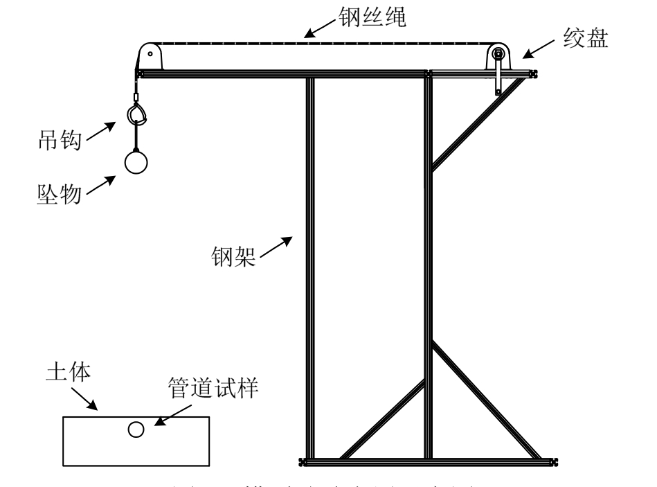 物理模型试验的布置如图1所示。试验仪器包括:1)重物释放装置,由型材构成支撑结构主体,并配有滑轮、绞盘、挂钩等,可实现重物在2 m范围内任意高度处自由下落;2)土体槽,长×宽×高为1 m×0.6 m×0.8 m。由亚克力板加工制成,用于进行砂土固结及埋置管道试样;3)三坐标测量仪,用于获取管道受撞击后的截面变形大小。