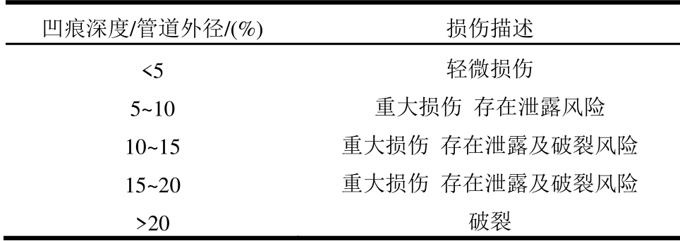 凹痕深度/管道外径/(%) 损伤描述 <5 轻微损伤 5~10 重大损伤 存在泄露风险 10~15 重大损伤 存在泄露及破裂风险 15~20 重大损伤 存在泄露及破裂风险 >20 破裂