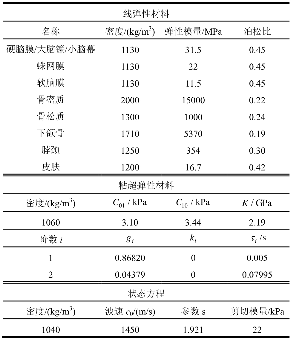 头部模型中的软脑膜、蛛网膜、硬脑膜、大脑镰、小脑幕、头骨、颈部与皮肤,均采用线弹性本构模型进行表征。基于头部模型中各组织所采用的本构模型,并参考相关文献[15—18,31],确定相应的材料参数,汇总于表1。