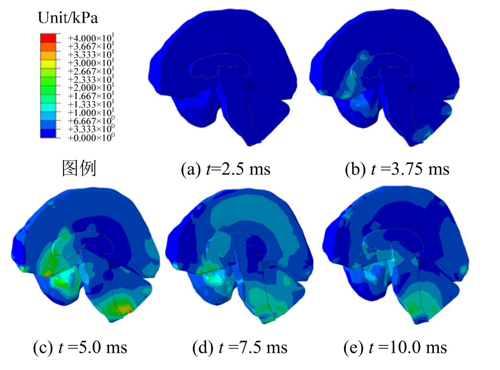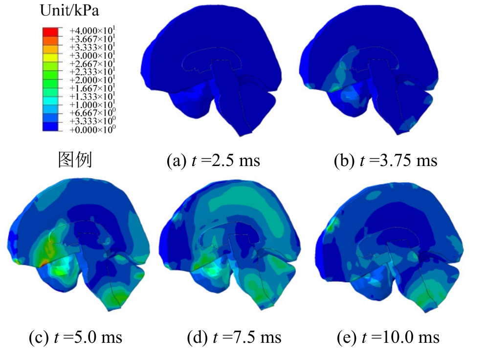 图14显示了枕部碰撞条件下颅内脑组织在不同时刻的Mises应力云图,与前额碰撞条件下Mises应力的分布规律基本一致:额颞叶处大脑部分与枕骨大孔处小脑脑干部分的Mises应力明显高于其它部位的相应值。