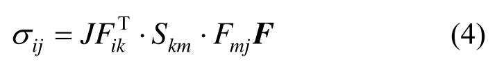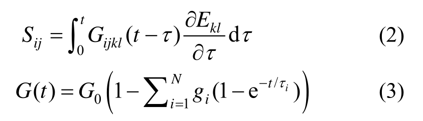 式中:Ekl为Green应变张量;G(t)为t时刻的剪切松弛模量,采用Prony级数进行展开;G0为瞬态剪切模量;gi和τi分别为无量纲剪切松弛模量参数与松弛时间。对应的Cauchy应力σij可表示为: