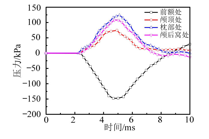 图10 枕部碰撞时颅内压力时程曲线