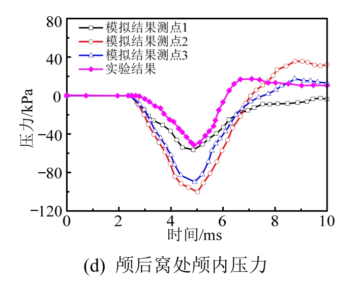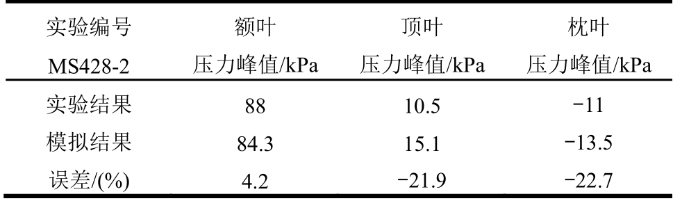 实验编号 MS428-2 额叶 压力峰值/kPa 顶叶 压力峰值/kPa 枕叶 压力峰值/kPa实验结果 88 10.5 -11 模拟结果 84.3 15.1 -13.5 误差/(%) 4.2 -21.9 -22.7