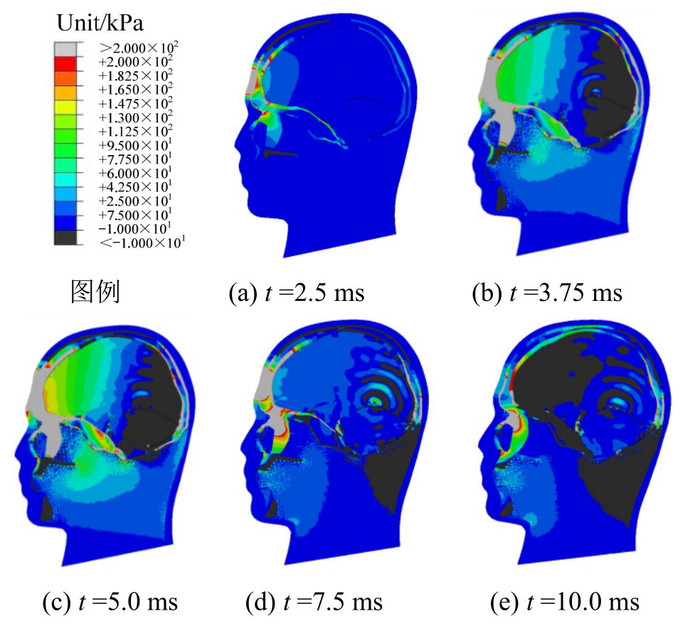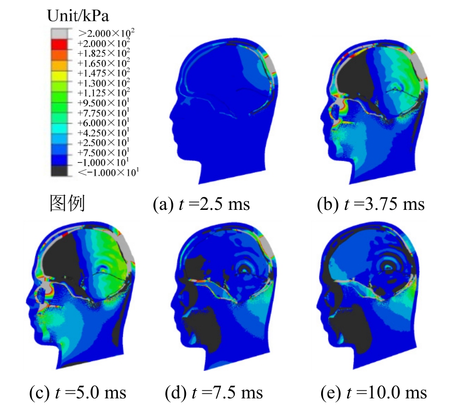 图12显示了枕部受到碰撞载荷作用时脑组织在特征时刻的压力云图。由于颅骨与脑组织的惯性差异,靠近枕部(撞击处)的后半部分脑组织与颅骨之间存在相对径向压缩位移,该处脑组织处于受压缩状态;而靠近前额部位(对撞处)前半部分脑组织与颅骨之间则存在相对径向拉伸位移,该处脑组织处于拉伸状态。这与前额碰撞时脑组织的压力分布规律是一致性。基于上述分析可知,颅骨与脑组织之间的相对径向位移决定脑组织压力,这与相关文献[22—23]中的结论基本上是一致的。