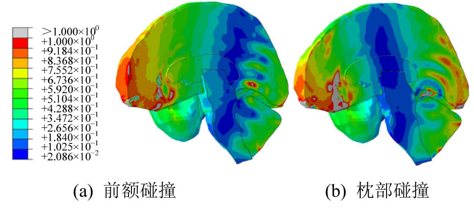 基于上述损伤准则,损伤权重系数m和n均取为1,压力损伤阈值PT和Mises应力损伤阈值σT分别取为173 kPa[22]与70 kPa[20],利用Python语言编写程序脚本对前额与枕部碰撞模拟结果进行处理,可以得到脑组织挫裂伤的损伤因子,如图17所示。