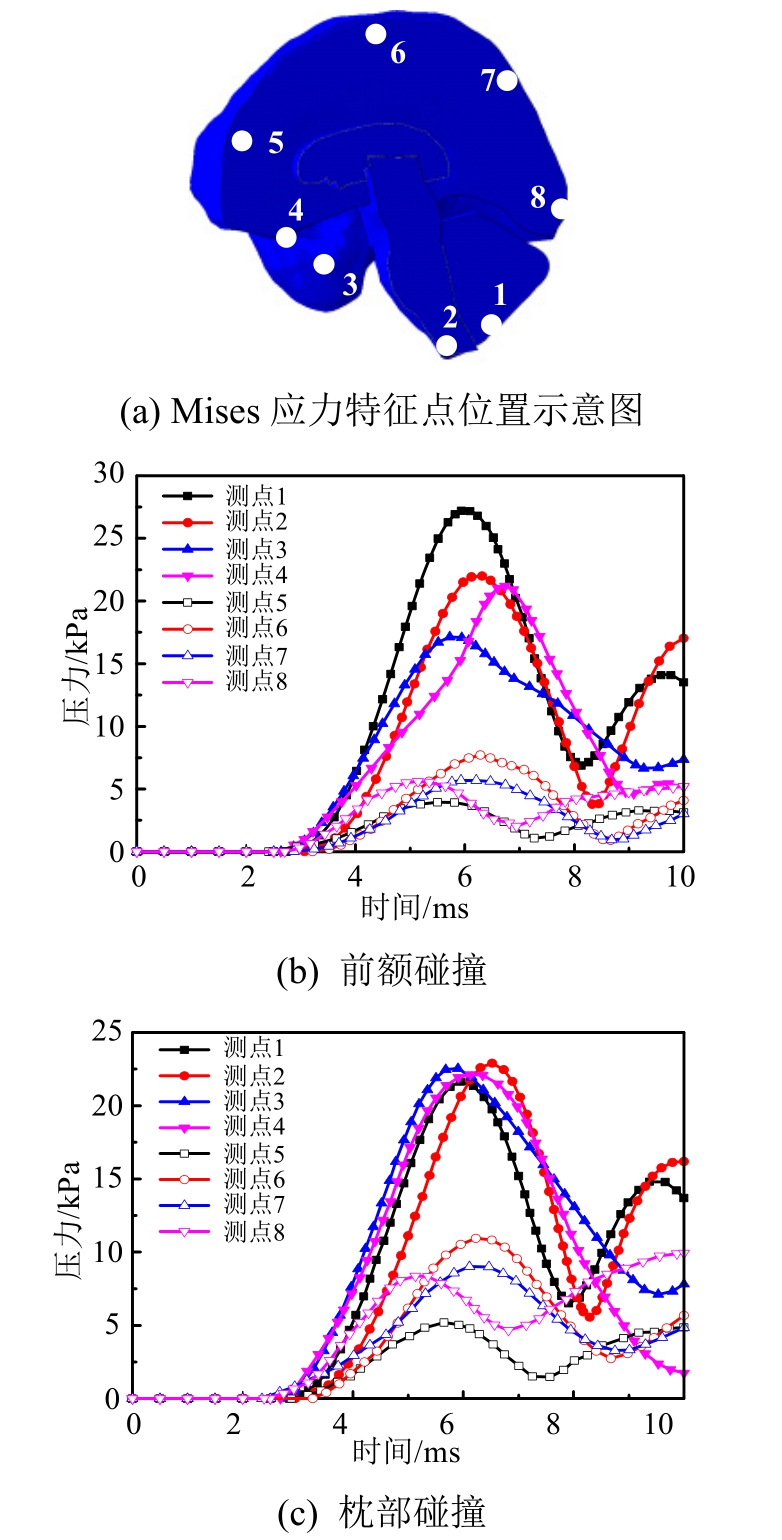 基于上述头部碰撞模型,可获取颅内压力在不同边界条件下的动态响应过程,与头部碰撞实验结果进行对比分析。为减小采样位置对模拟结果与实验结果对比分析的影响,在前额、颅顶、枕部与颅后窝处各取三个特征点的颅内压力时程曲线,特征点位置如图6所示。