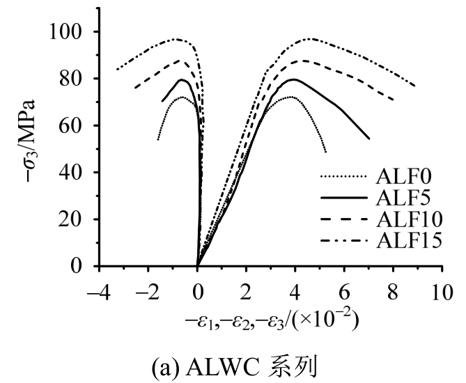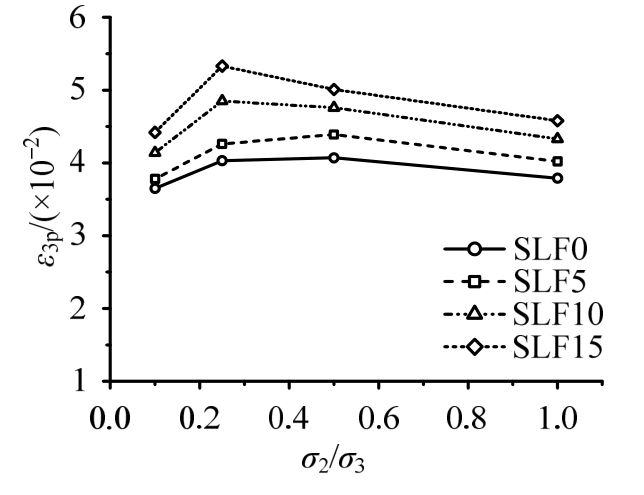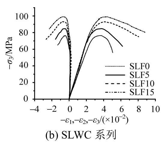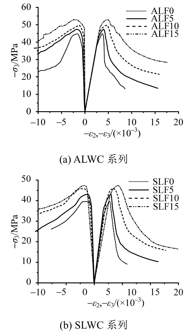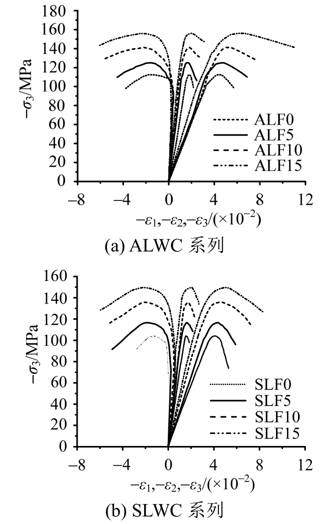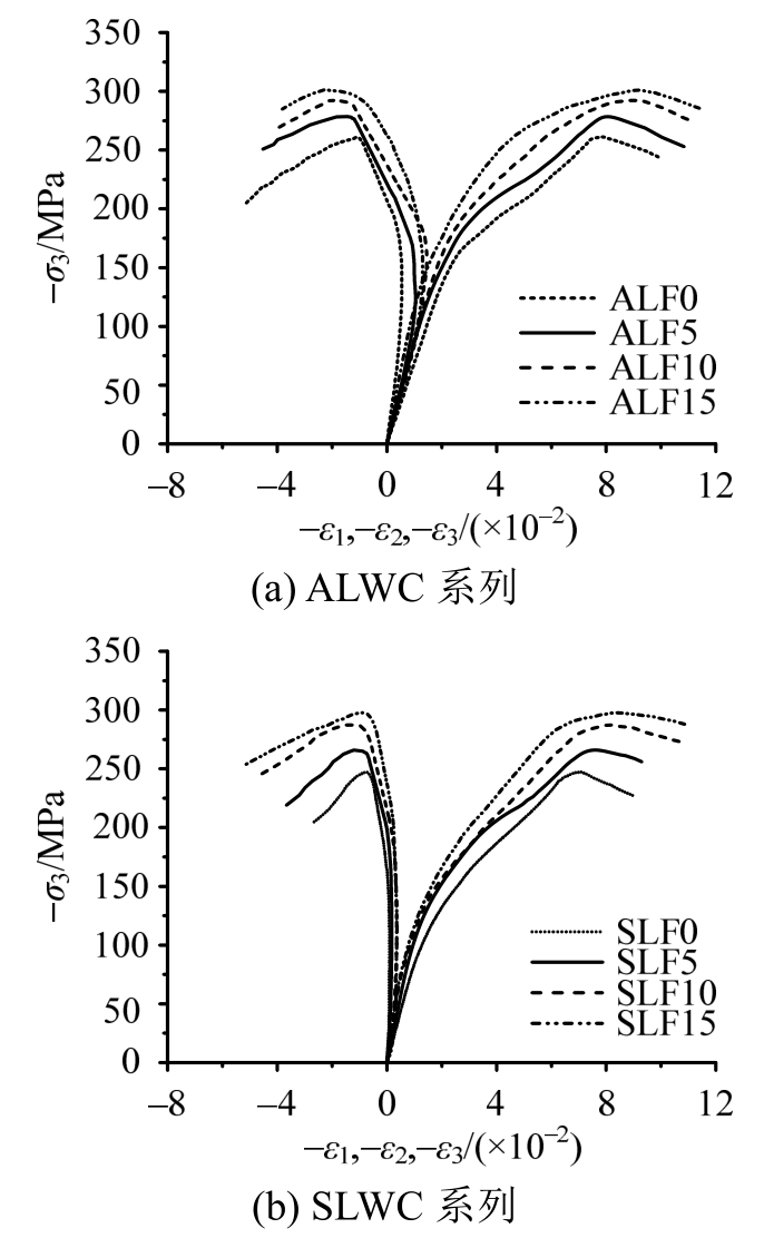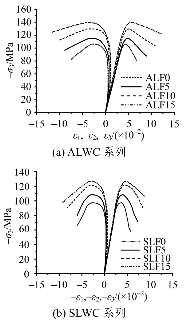 高应力比水平(σ1/σ3=0.25)下,考虑到试验机最大加载能力,只进行了应力比σ1/σ2/σ3=0.25∶0.25∶1的试验,如图7所示,无纤维轻骨料混凝土主压向应力-应变曲线上升段出现了明显的流塑平台,这是由于高性能轻骨料混凝土水泥砂浆品质较高,界面层微观结构比较致密,但内部轻质粗骨料比较软,在高压应力作用下首先被挤压破碎,应力重分布后大部分压应力由水泥砂浆体继续承担,伴随着试块大幅度的压缩变形而出现了应力平台区域,随后试块在“紧密”状态下,继续承受更大的压应力,曲线继续上升,出现强化段;钢纤维的掺入增强了轻骨料混凝土中“砂浆骨架”的延性,使其在应力重分布过程中不会发生突然的变形骤增,从而钢纤维轻骨料混凝土的应力应变曲线上没有出现明显的应力平台区。对于曲线的下降段,无纤维轻骨料混凝土和钢纤维轻骨料混凝土都表现出了明显的受压延性特征,纤维的掺入对应力-应变曲线下降段几乎无影响。峰值应变ε3p随着钢纤维掺量的增加而有明显的增加,而ε1p与钢纤维掺量关系不大,由于全轻混凝土基体和次轻混凝土基体粗骨料颗粒外形的不同,钢纤维全轻混凝土的最大横向变形ε1p大于钢纤维次轻混凝土。