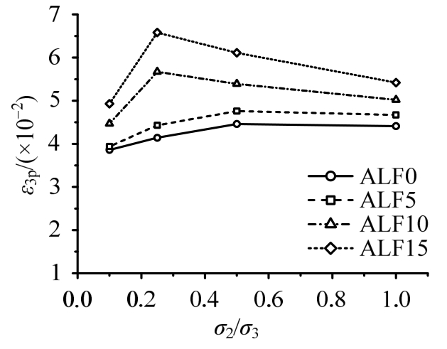 图9为钢纤维全轻和次轻混凝土中间主应力对最大主压应力方向峰值压应变的影响规律。可以看出中间主应力对峰值应变ε3p有着显著的影响,并且这种影响程度随着钢纤维含量的增加而明显增大,在同一应力比(σ1/σ3)水平下,随着中间主应力σ2的增长,ε3p绝对值先增大后减小,对无纤维轻骨料混凝土和钢纤维掺量为0.5%时的轻骨料混凝土,最大值大致发生在σ2/σ3=0.5附近,在较高的钢纤维掺量情形下(Vf=1%和1.5%),最大值大致发生在σ2/σ3=0.25附近。