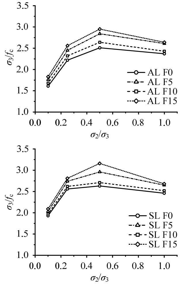 从表3可以看出,无纤维时,全轻和次轻混凝土双轴等压(σ2/σ3=1.0)相对强度分别为1.13和1.21,随着钢纤维掺量的增加,双轴等压强度相对值增大,钢纤维掺量为1.5%时,双轴等压强度增大倍数分别为1.43和1.47。Yin等[13]对钢纤维增强普通骨料混凝土的研究发现普通骨料混凝土双轴等压强度相对值同样随着钢纤维掺量的增加而增加,当钢纤维掺量达到2%时,双轴等压强度相对值为1.7。