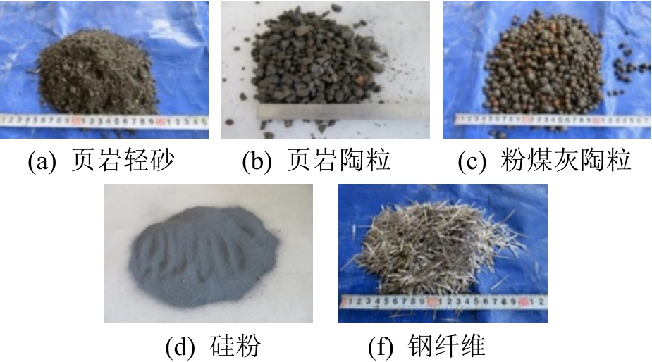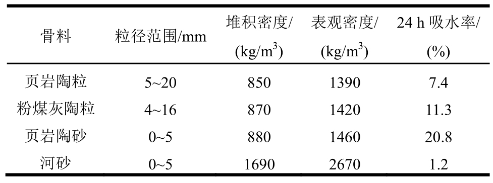 骨料 粒径范围/mm 堆积密度/(kg/m3)表观密度/(kg/m3)24 h吸水率/(%)页岩陶粒 5~20 850 1390 7.4粉煤灰陶粒 4~16 870 1420 11.3页岩陶砂 0~5 880 1460 20.8河砂 0~5 1690 2670 1.2
