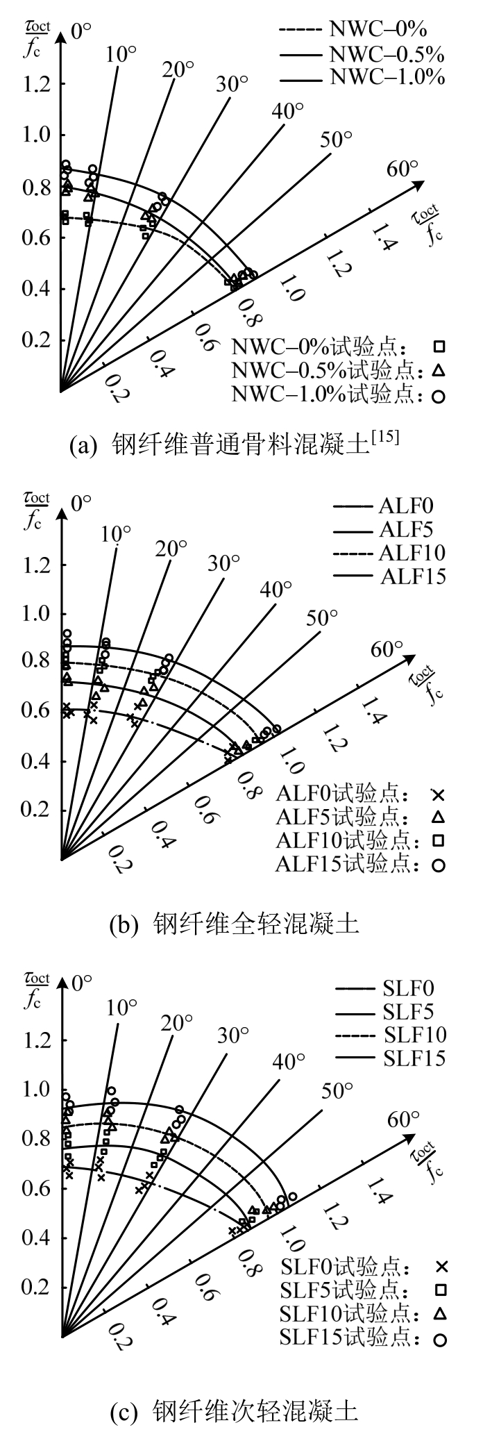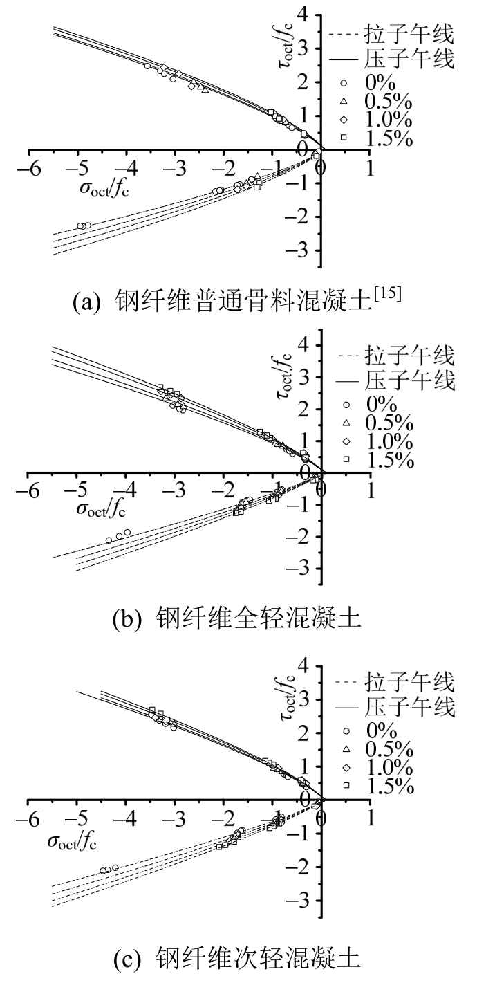 首先将上述强度准则的拉压子午线与文献[15]中的钢纤维普通骨料混凝土拉压子午线上的试验数据进行对比验证,如图11(a)所示,同时,将该强度准则的拉压子午线与本文进行的钢纤维增强全轻混凝土和次轻混凝土试验数据进行对比,如图11(b)和图11(c)所示,可以发现,本文所提出的破坏准则模型基本能预测出钢纤维普通骨料混凝土、钢纤维全轻混凝土和钢纤维次轻混凝土的多轴强度在拉压子午线上的变化规律:随着钢纤维掺量的增加,拉压子午线有向外扩张的趋势,而拉子午线上剪切强度有较为明显的增加,钢纤维在不同材性的混凝土中对拉子午线的增强作用比较显著,这是由于拉子午线上对应的破坏形态一般为拉断破坏(单轴拉)和层状劈裂破坏(双轴等压),而钢纤维对拉伸裂缝有比较强的桥联作用,钢纤维有效地增强了层状块体间的联结,并且钢纤维掺量越大,长径比越大,这种联结越强。无钢纤维和小掺量钢纤维轻骨料混凝土拉压子午线更偏向于横轴,而无钢纤维普通骨料混凝土的拉压子午线开口已经比较大,只有当钢纤维掺量比较大时,钢纤维轻骨料混凝土的开口逐渐扩大,比较接近普通骨料混凝土破坏包络面,换言之,同样钢纤维掺量和类似钢纤维长径比条件下,高性能轻骨料混凝土拉子午线扩张的幅值要高于普通骨料混凝土,这说明钢纤维在多向受力状态下对轻骨料混凝土的增强作用,要强于普通骨料混凝土。