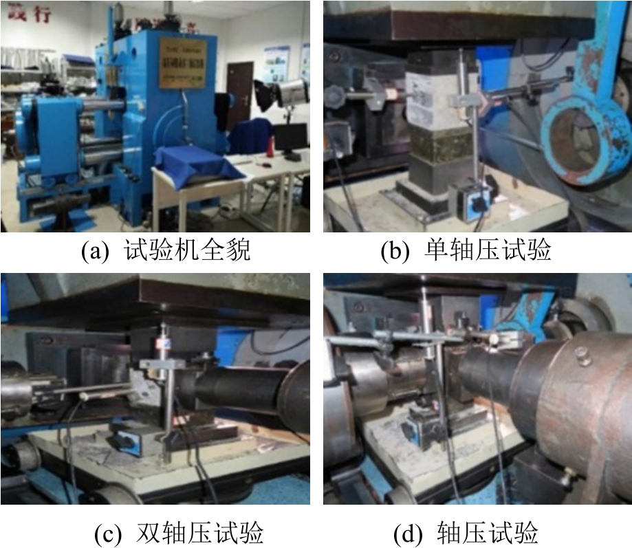规定拉应力和拉应变为正,-σ1≤-σ2≤-σ3,此处σ1、σ2、σ3分别为三向主应力。除了单轴拉压之外,选取其他应力比有σ1/σ2/σ3=0∶1∶1(双轴等压)、0.1∶0.1∶1、0.1∶0.25∶1、0.1∶0.5∶1、…、0.25∶0.25∶1等。为保证单调比例加载全过程中三个方向的应力比恒定,以σ3方向主轴为主动的位移反馈控制,设定加载位移速率为0.004 mm/s,在其他两个压应力方向即σ1和σ2方向则以与σ3方向荷载成一定比例的荷载反馈控制加载。正式加载前先沿试件的两个加载方向进行3次预压,荷载为相应单轴压破坏荷载的40%左右,保证试件物理对中。每个应力比下进行3至5个试块的三轴试验,并剔除异常数据,保证至少3个试件数据有效可靠。变形量测是通过高精度位移传感器(LVDT),在每向加载板两侧通过位移支架布置两套LVDT,如图2(b)~图2(d)所示,将相对两面所测变形值取平均,且扣除事先标定的减摩垫层相应变形值,得到最终的变形量。