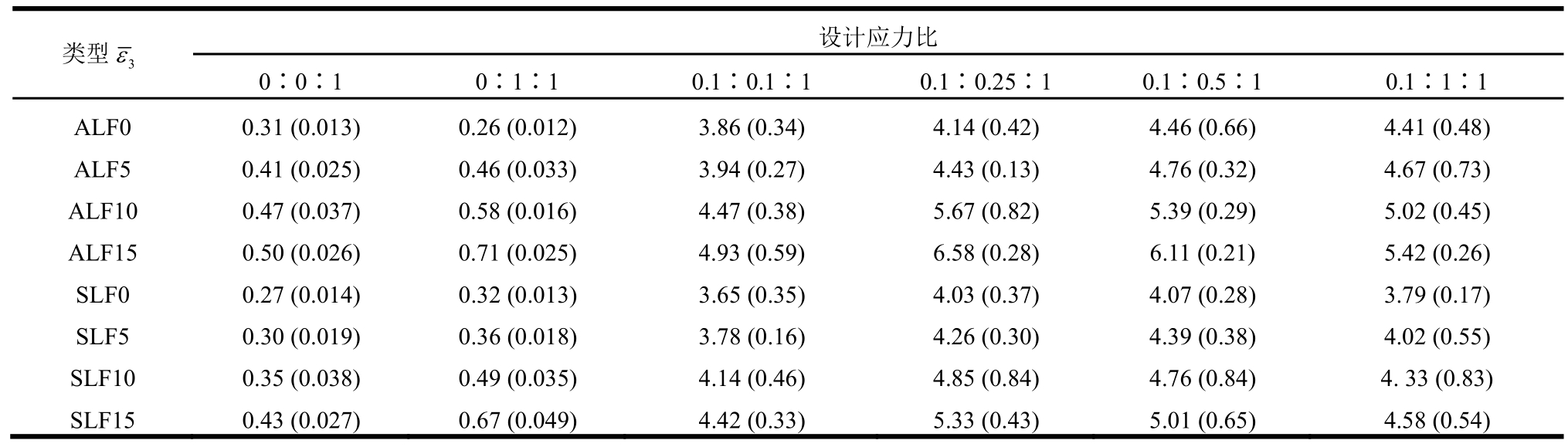 类型ε3设计应力比0∶0∶1 0∶1∶1 0.1∶0.1∶1 0.1∶0.25∶1 0.1∶0.5∶1 0.1∶1∶1 ALF0 0.31(0.013)0.26(0.012)3.86(0.34)4.14(0.42)4.46(0.66)4.41(0.48)ALF5 0.41(0.025)0.46(0.033)3.94(0.27)4.43(0.13)4.76(0.32)4.67(0.73)ALF10 0.47(0.037)0.58(0.016)4.47(0.38)5.67(0.82)5.39(0.29)5.02(0.45)ALF15 0.50(0.026)0.71(0.025)4.93(0.59)6.58(0.28)6.11(0.21)5.42(0.26)SLF0 0.27(0.014)0.32(0.013)3.65(0.35)4.03(0.37)4.07(0.28)3.79(0.17)SLF5 0.30(0.019)0.36(0.018)3.78(0.16)4.26(0.30)4.39(0.38)4.02(0.55)SLF10 0.35(0.038)0.49(0.035)4.14(0.46)4.85(0.84)4.76(0.84)4.33(0.83)SLF15 0.43(0.027)0.67(0.049)4.42(0.33)5.33(0.43)5.01(0.65)4.58(0.54)