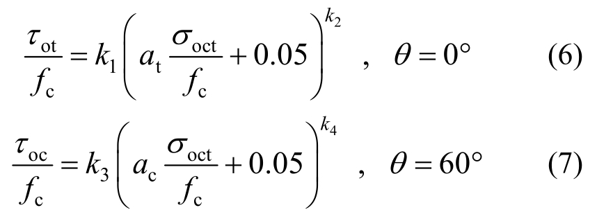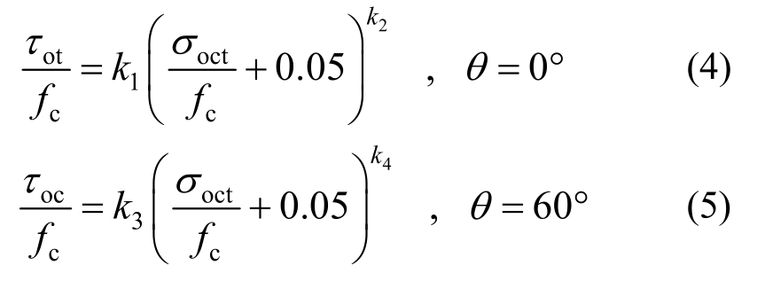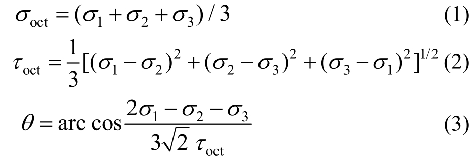 多轴应力状态下混凝土的强度,可以用以三个主应力轴为坐标的空间破坏曲面来表示,又称为破坏包络面,但空间破坏包络面不便绘制也不适用于直接应用,一般用八面体正应力和剪应力作为横纵坐标表示的拉、压子午线以及偏平面上的包络线来表示。首先按照下式将试验得到的混凝土极限破坏时的三个主应力实测值转换为八面体应力空间的正应力、剪应力和相似角: