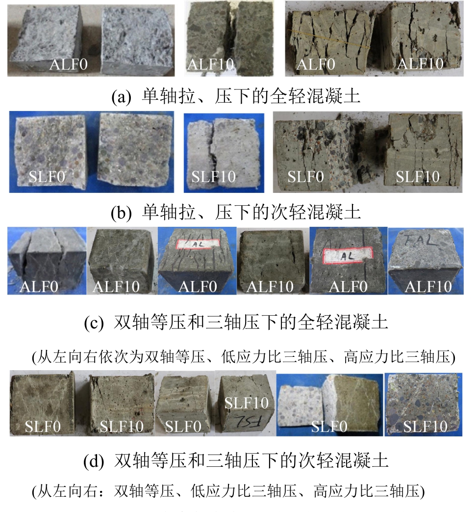 图10为高性能轻骨料混凝土单轴拉、压,双轴等压和三轴压时的典型破坏形态。单轴压时为典型的柱状破坏,如图10(a)和图10(b)所示,试块被贯穿裂缝分成若干柱状单元块体,钢纤维轻骨料混凝土则裂而不散,各单元块体间有钢纤维相连;单轴拉为典型的拉断破坏,试块中部形成了一条垂直受力方向的裂缝,轻骨料混凝土水泥砂浆体强度高于粗骨料,裂缝直接贯穿粗骨料,而普通骨料混凝土裂缝一般沿着粗骨料和水泥砂浆之间的界面层扩展[17],钢纤维掺量比较大时,钢纤维轻骨料混凝土拉伸断面上依旧有少数纤维未被完全拔出;双轴等压下,由于泊松比效应在非加载方向上的应变ε1为拉应变,无纤维轻骨料混凝土为典型的片状劈裂破坏,如图10(c)和图10(d)所示,而对钢纤维轻骨料混凝土,钢纤维在裂缝面的桥联作用可以阻滞垂直荷载方向上的裂缝扩展,相当于在未加载方向上施加了一个很小的约束压应力,从而表现为压剪型破坏。在三轴压应力条件下,钢纤维掺量对破坏形态无明显的影响,大多数试块为斜剪破坏。