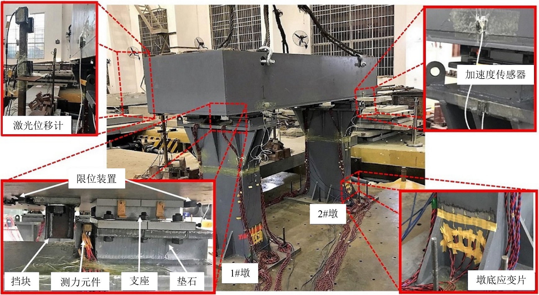 除碰撞力的测试外,试验还将对墩顶位移和加速度、梁底位移和加速度以及墩底弯矩进行测量,试验模型及测试装置的布置如图6所示。其中加速度测点一共布置8个,分别布置在每个桥墩墩顶两侧及对应的梁底,用以测量在地震激励下相应位置的横向加速度时程;位移测点一共布置4个,分别位于两个桥墩的墩顶及对应的梁底;通过在桥墩底部布置应变片来测量墩底弯矩,墩底弯矩时程M(t)按式(3)计算: