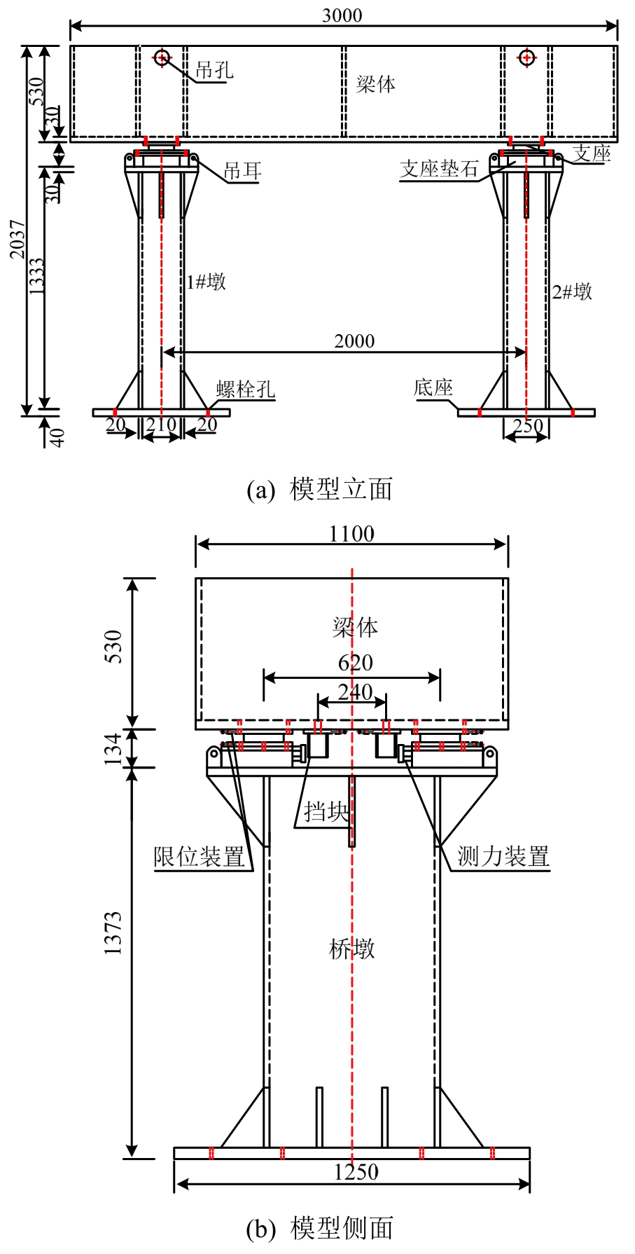 在桥梁结构横向地震碰撞过程中,上部梁体的横桥向刚度远大于挡块的变形刚度,梁体在地震过程中相当于一个刚体,因此桥梁模型的跨度由于振动台尺寸限制未严格按照相似比设计,但上部梁体质量严格遵循相似关系。试验模型参数见表2,试验模型设计如图1所示。