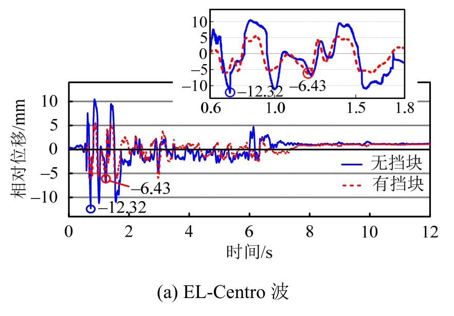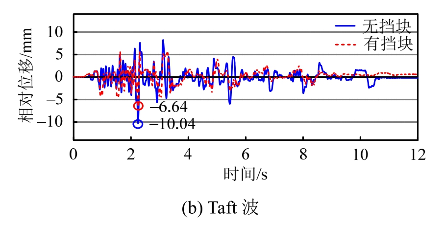 强震作用下,当横向固定支座的限位板破坏后,支座就会失去对上部梁体的横向限位能力,墩梁间横向相对位移会显著增大。当墩梁横向相对位移超过挡块-垫石初始间隙时,挡块就会与垫石发生碰撞,从而起到对上部梁体的限位作用。图9为两种地震激励下,有挡块和无挡块时的墩梁相对位移时程的对比。由图可知:挡块的设置会显著改变地震激励下墩梁横向相对位移响应,墩梁横向相对位移峰值显著减小,在EL-Centro波和Taft波激励下,不设置挡块时墩梁相对位移峰值分别为12.32 mm、10.04 mm,在设置挡块时墩梁相对位移峰值分别为6.43 mm和6.64 mm。由墩梁横向相对位移时程的局部放大图(图9(a))可以发现,在未设置挡块时,墩梁相对位移的峰值点通常呈现出“凸”形,而在设置挡块的情况下,当墩梁相对位移超过挡块-垫石间隙时,峰值点通常呈现出“凹”形,说明挡块的设置有效地限制了墩梁横向相对位移的发展,能够有效地防止地震作用下横向落梁震害。通过试验结果还可以发现,由于普通球型钢支座没有良好的复位能力,梁体震后的残余位移具有一定的随机性,部分工况的残余位移较大。