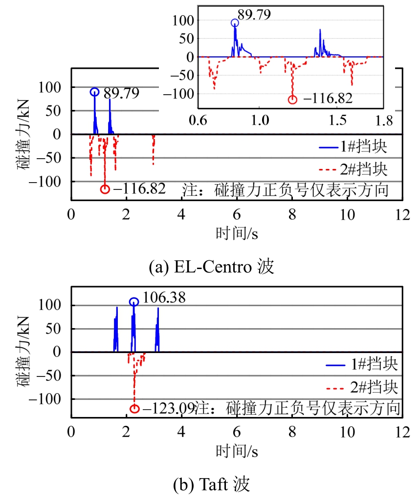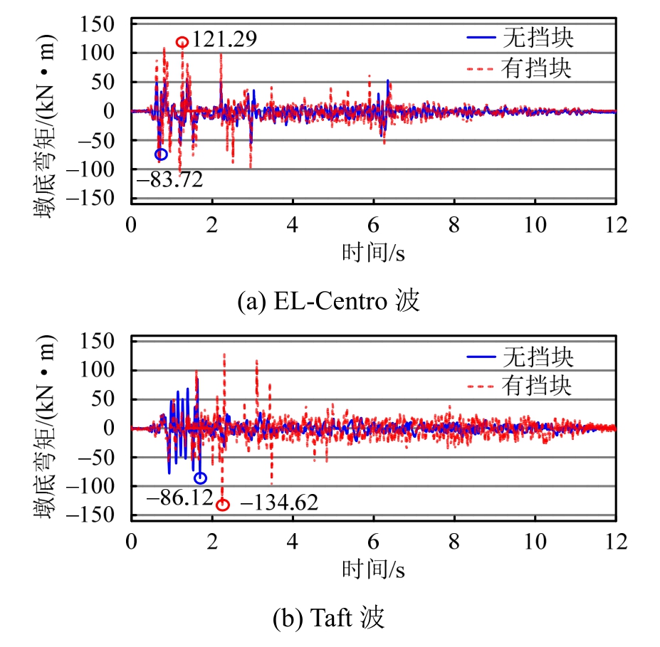 碰撞对于墩底弯矩的影响如图12所示。由图可知,碰撞会显著增大桥墩墩底弯矩峰值。当不设置挡块时,在EL-Centro波和Taft波激励下,墩底弯矩响应峰值分别为83.72 kN·m、86.12 kN·m;当设置挡块时,墩底弯矩峰值分别为121.29 kN·m、134.62 kN·m,墩底弯矩峰值的增幅分别为44.8%和56.3%。其主要原因是设置挡块之后,挡块与垫石之间的碰撞力会传向桥墩,从而增大墩底弯矩响应。因此,在进行抗震设计时应当考虑碰撞对桥墩地震需求的放大效应。