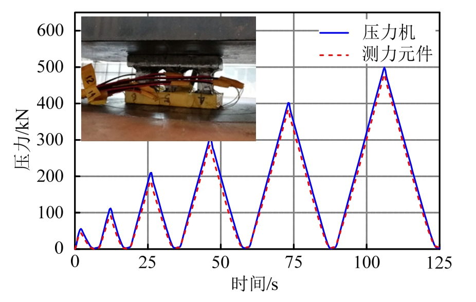 为了验证此碰撞测力装置的精确性,在振动台试验前对测力装置开展了压力试验。将测力元件放置于电液伺服万能试验机上进行不同加载速率的反复加卸载,同时通过IMC数据采集装置记录测力元件钢棒上的应变时程,将应变数据换算成合力后与万能试验机的压力时程进行对比。图5为加载速率为30 kN/s时万能试验机与测力元件的测试结果对比(其他加载速率下,测试的结果类似)。由图可知,采用测力装置测得的压力时程与万能试验机的测试结果基本吻合,压力峰值误差在2%以内,说明该测力装置能在试验中较为准确地测得挡块与垫石之间的碰撞力时程。同时由测试结果可以发现,测力装置在压力达到500 kN时仍然保持弹性状态,而挡块的破坏荷载约为220.6 kN,说明测力装置在实验过程中不会损坏,确保了测力装置在试验过程中始终处于弹性工作状态。