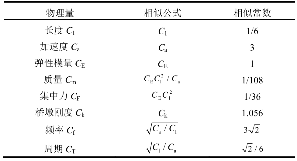 物理量 相似公式 相似常数长度C1 C1 1/6加速度Ca Ca 3弹性模量CE CE 1质量Cm 2 CC 1/36桥墩刚度Ck Ck 1.056频率Cf CCC 1/108集中力CF 2 El/a El 3周期CTimages/BZ_168_705_815_809_856.png images/BZ_168_1042_824_1080_853.pngimages/BZ_168_705_877_809_919.png images/BZ_168_1020_886_1054_915.png/6