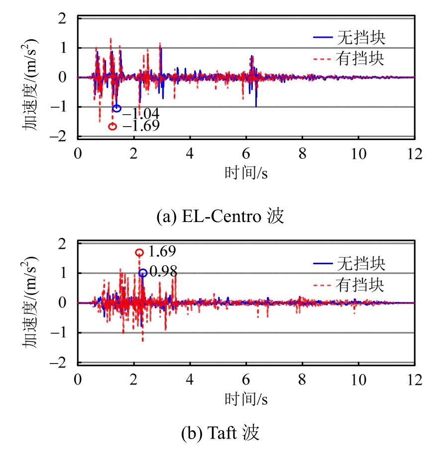 图11给出了在两种地震波激励下,有无挡块时梁体加速度时程的对比。由图可知,挡块与垫石之间的碰撞对梁体加速度有显著的影响,当未设置挡块时,在EL-Centro波和Taft波激励下,梁体加速度峰值分别为1.04 m/s2、0.98 m/s2,当设置挡块时,加速度峰值均为1.69 m/s2;在两种地震波激励下梁体加速度峰值的增幅分别为62.5%和72.4%。这主要是因为在不设置挡块时,上部梁体的约束作用只由支座提供,梁体的横向地震力由支座传递,而在设置挡块后,挡块与垫石之间的碰撞给予梁体额外的脉冲作用,所以梁体加速度峰值显著增大。
