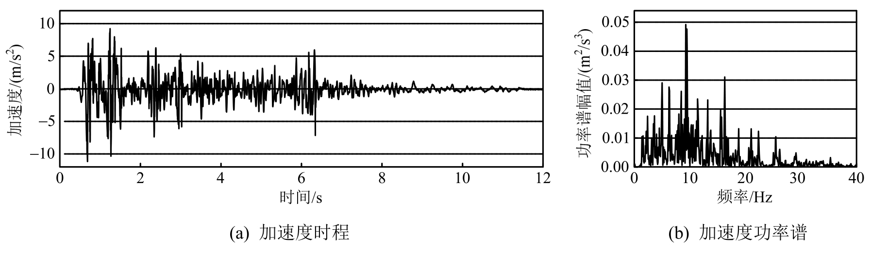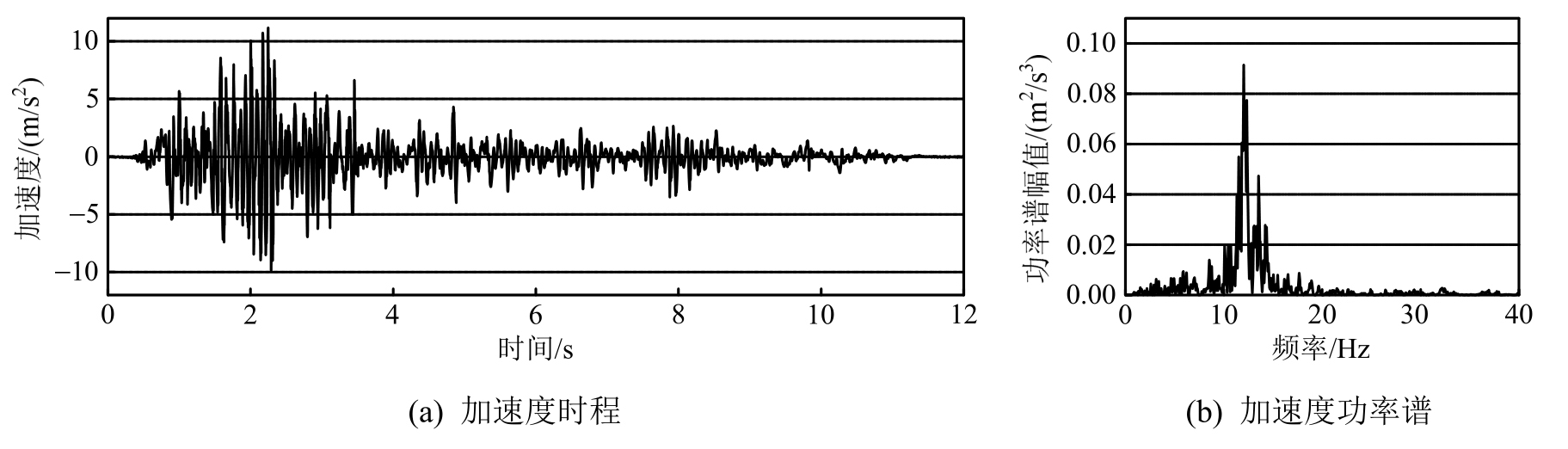 进行压缩,调幅后的加速度峰值为11.172 m/s2。振动台台面实测加速度时程及加速度功率谱如图7和图8所示。