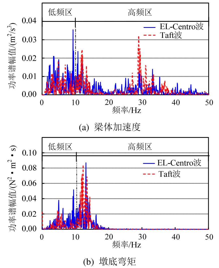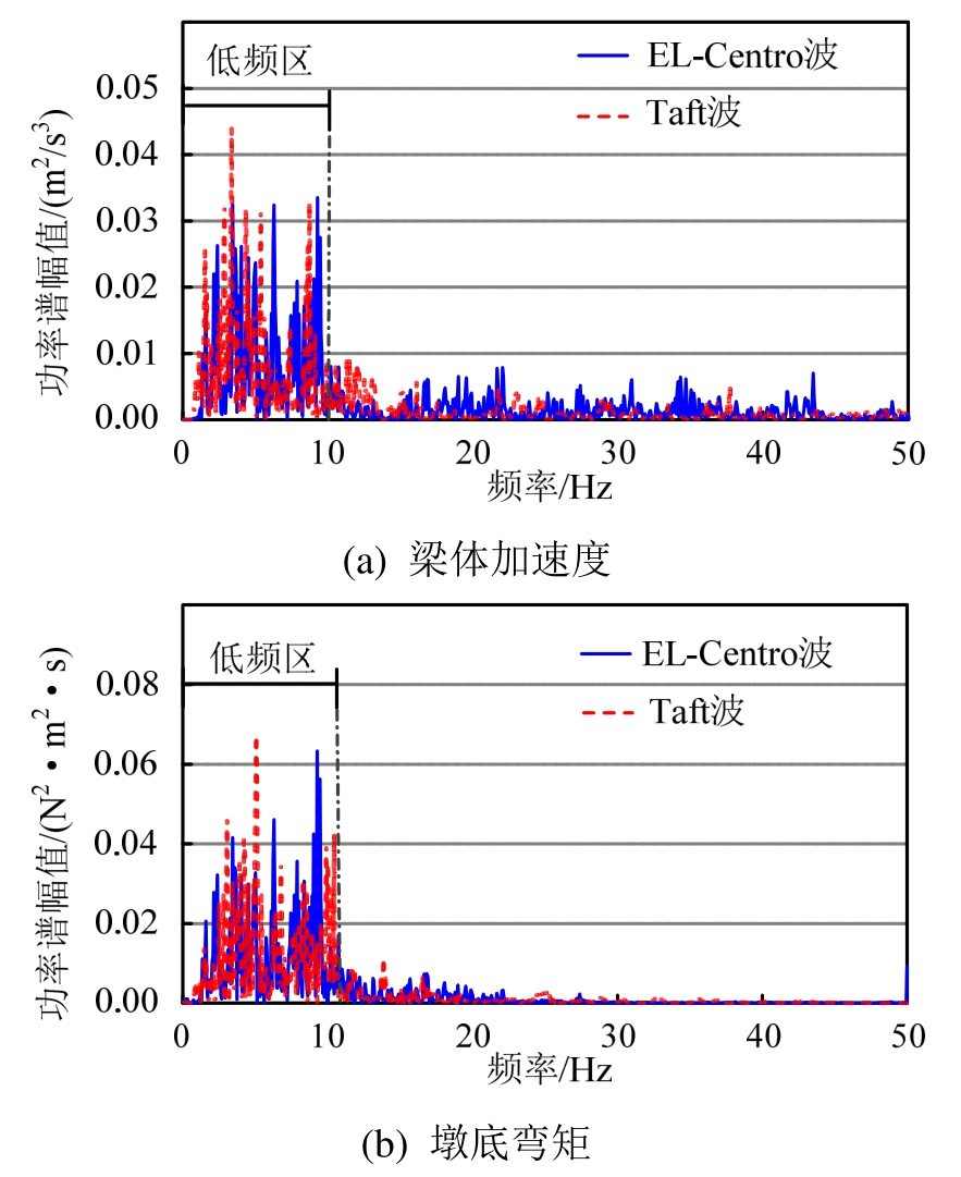 由第2.3节分析可知,在EL-Centro和Taft波激励下梁体加速度的增幅分别为62.5%和72.4%,而墩底弯矩的增幅分别为44.8%和56.3%,说明梁体加速度受碰撞效应的影响更大。其原因可以从图15中寻找,对于墩底弯矩而言,碰撞所激起的高频成分主要在10 Hz~20 Hz;而对于梁体加速度响应,除10 Hz~20 Hz区间之外,在25 Hz~45 Hz区间,加速响应功率谱仍具有较大的幅值,甚至高于基频区的功率谱幅值。所以相较于墩底弯矩,碰撞对于梁体加速度的影响更为显著。