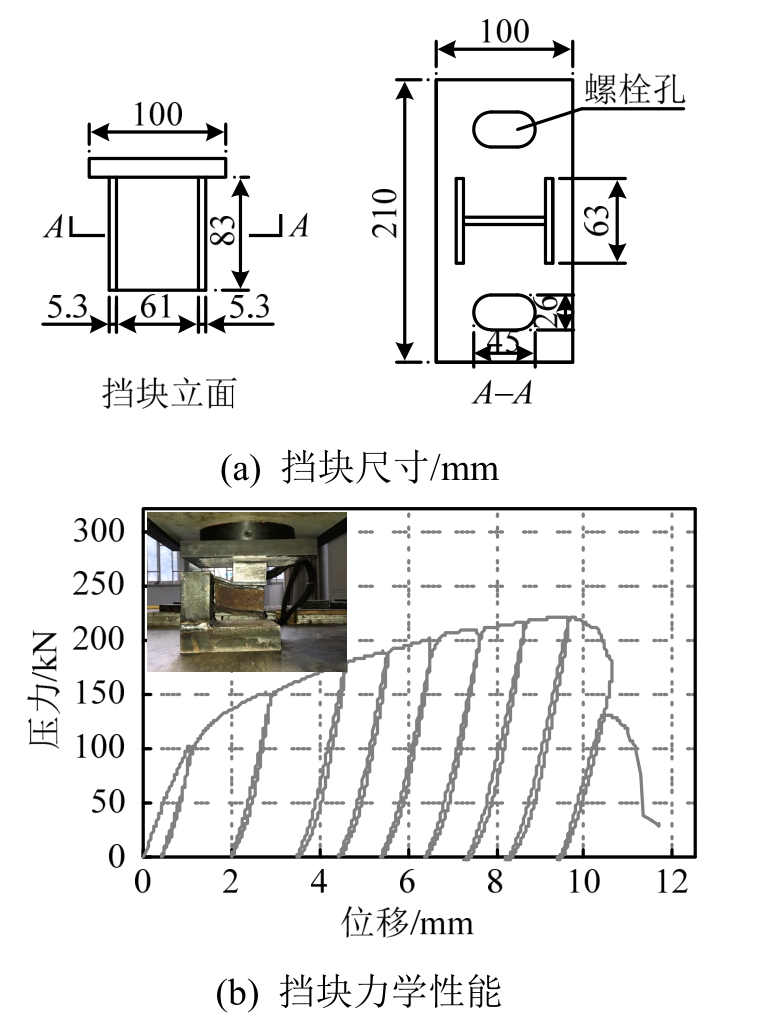 试验模型中的挡块严格按照尺寸相似常数(Cl=1/6)进行缩尺,材料采用与原型一致的Q235钢材,缩尺后的尺寸如图3(a)所示。在挡块顶板处开有两个45 mm×26 mm的“U”形孔,用以调节挡块-垫石初始间隙的大小,为防止挡块在碰撞过程中发生滑动,当挡块调整到合适位置时用高强螺栓拧紧,并用限位装置固定。为测定挡块的力学性能,将挡块焊接于“L”形台座上,对挡块进行单侧循环加载试验,测试结果如图3(b)所示。由图可知,钢挡块在试验过程中表现出了较高的强度和良好的变形能力,挡块的屈服荷载约为120.0 kN,破坏荷载约为220.6 kN。