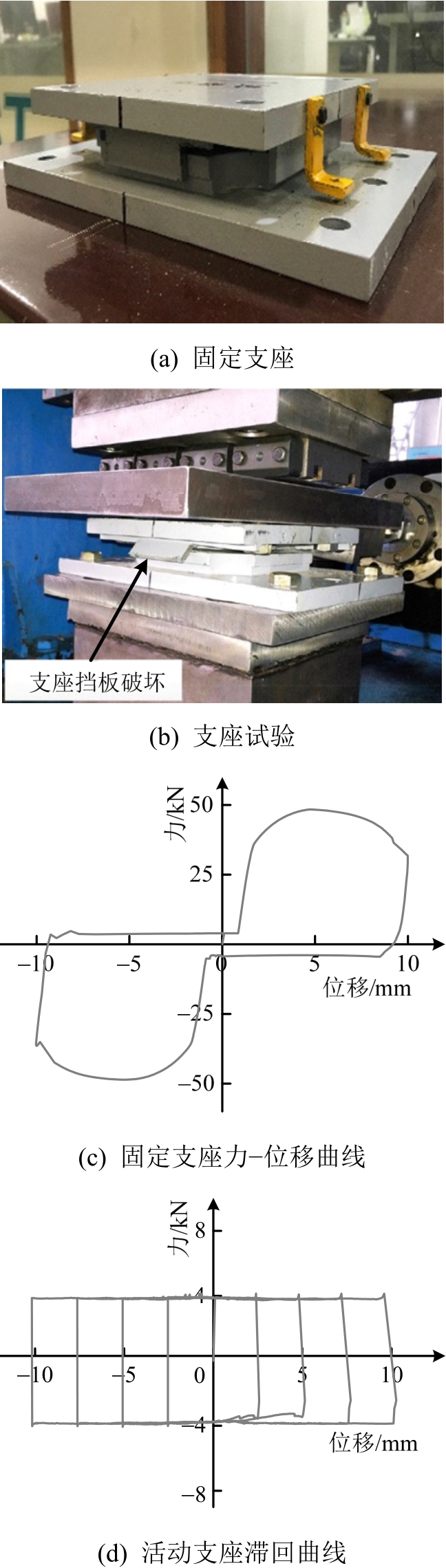 桥梁原型的支座为TJQZ6000球型钢支座,支座的竖向承载力为6000 kN,横向固定支座(固定支座及纵向活动支座)的横向承载力为1800 kN,缩尺后的横向承载力应为50 kN。为使支座力学参数严格按照相似比缩尺,试验按照缩尺后的支座力学性能要求设计了一批支座,并进行了支座的力学性能试验。图2(a)为设计的固定支座,固定支座主要由两侧的挡板提供限位作用,在设计时可以通过改变支座限位板的长度来调整横向剪断力,横向固定支座的力-位移关系如图2(c)所示,由图可知,设计的固定支座剪断力约为49.0 kN,满足试验缩尺要求。当固定支座的挡板破坏后,其力学模型与活动支座相同。活动支座的滞回曲线如图2(d)所示,活动支座的滑动摩擦力约为4.0 kN。试验中支座会出现不同程度的损伤,因此在每个工况做完后便进行一套支座的更换。