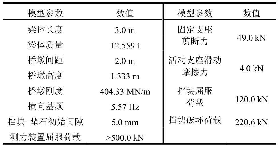 模型参数 数值 模型参数 数值梁体长度 3.0 m 固定支座49.0 kN剪断力梁体质量 12.559 t桥墩间距 2.0 m 活动支座滑动4.0 kN摩擦力桥墩高度 1.333 m桥墩刚度 404.33 MN/m 挡块屈服120.0 kN荷载横向基频 5.57 Hz挡块-垫石初始间隙5.0 mm 挡块破坏荷载220.6 kN测力装置屈服荷载>500.0 kN