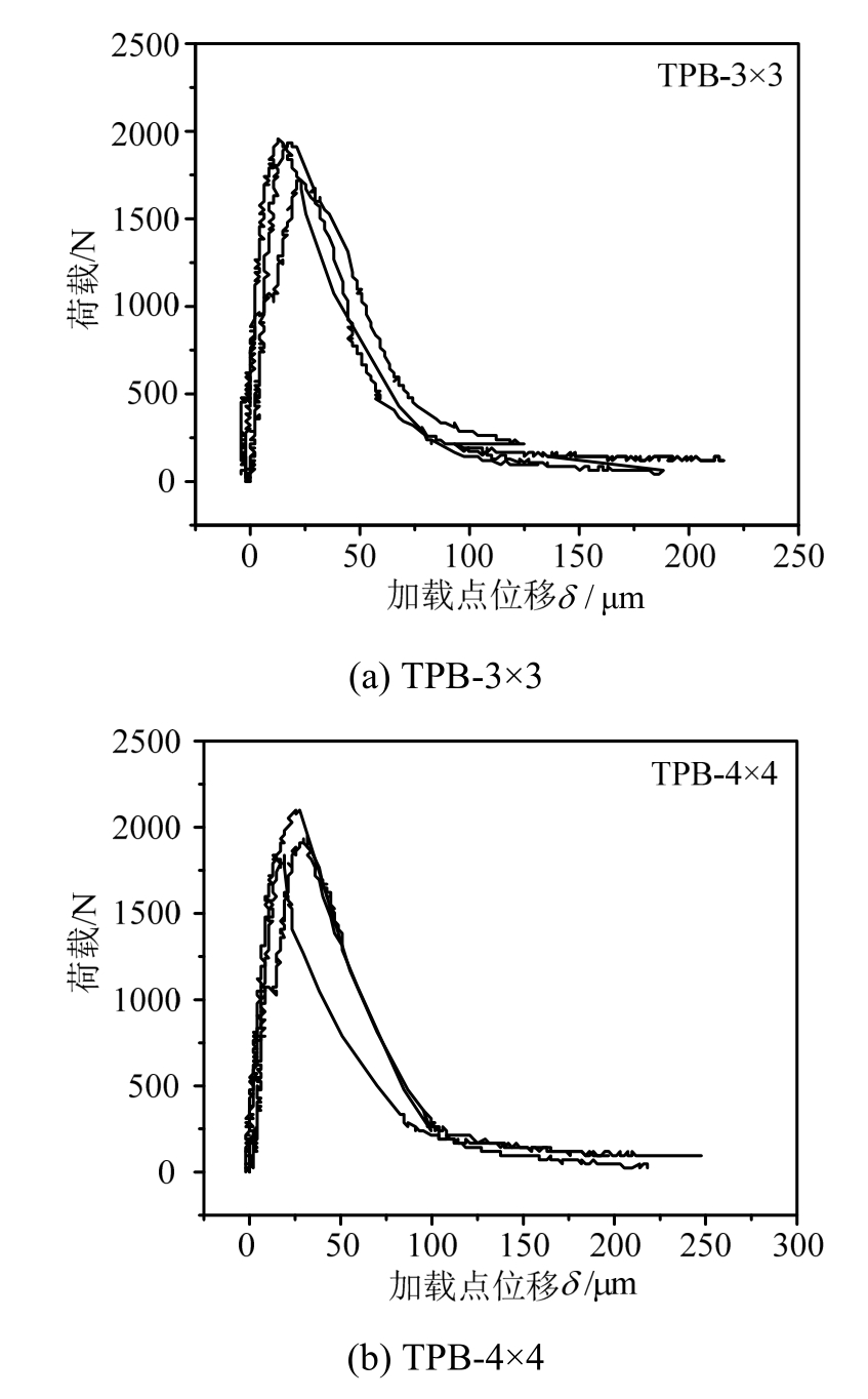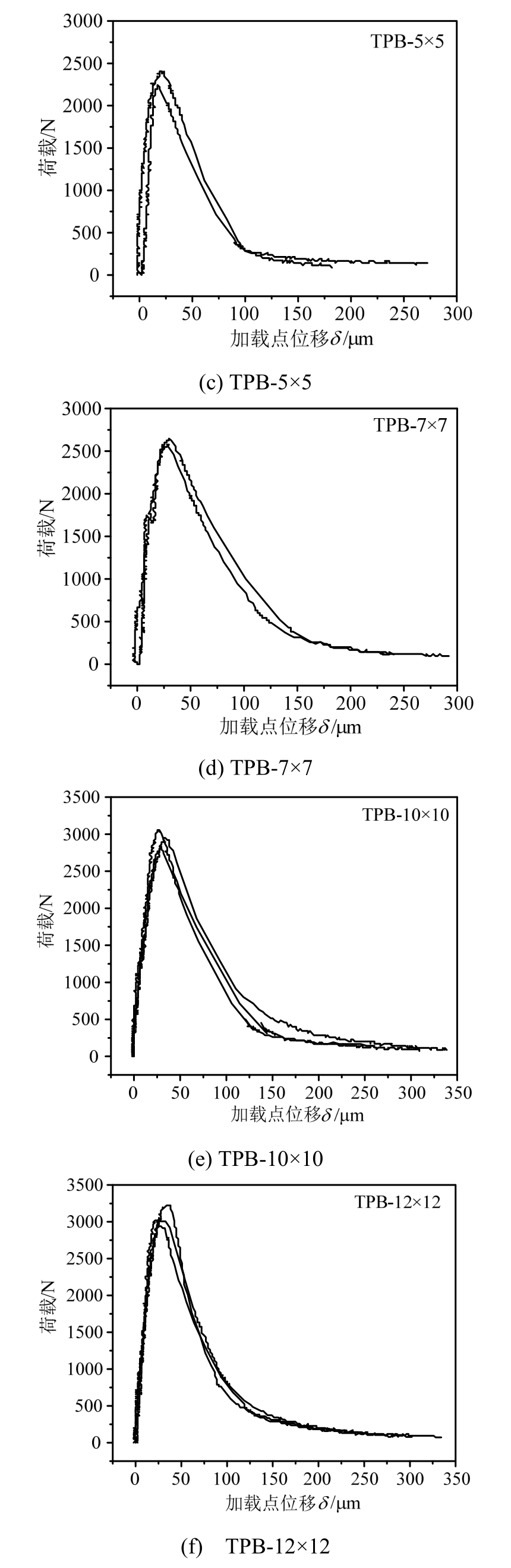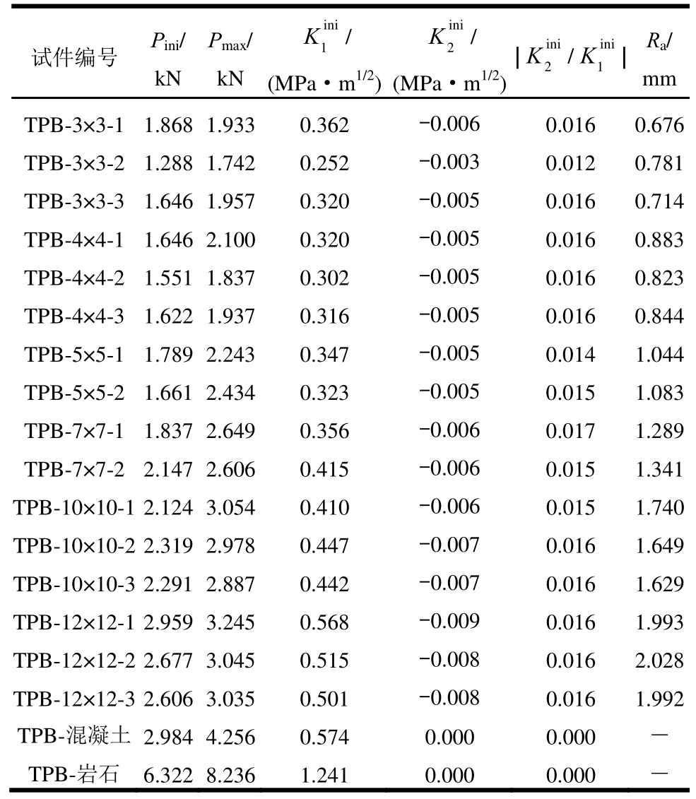 表2列出了不同工况下的岩石-混凝土界面粗糙度、起裂荷载、峰值荷载、起裂断裂韧度的试验与计算数据。由表2可知,本文采用的刻槽方式能够获得较大范围的粗糙度数值,且随着粗糙度的增大,试件的起裂荷载呈上升趋势,其中,试件TPB-5×5-3和 TPB-7×7-3由于加载机器操作原因没能得到完整的加载曲线,未纳入试验结果统计。Ⅱ型起裂断裂韧度