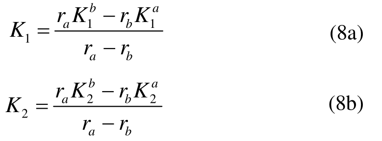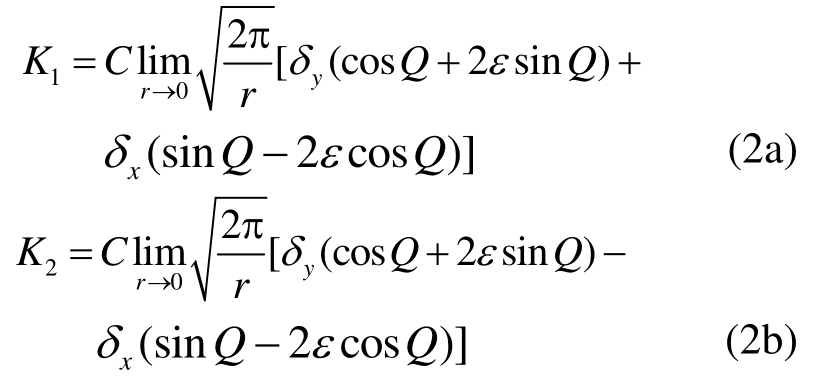 然后由式(2)的线性插值公式计算裂缝尖端的应力强度因子K1和K2。